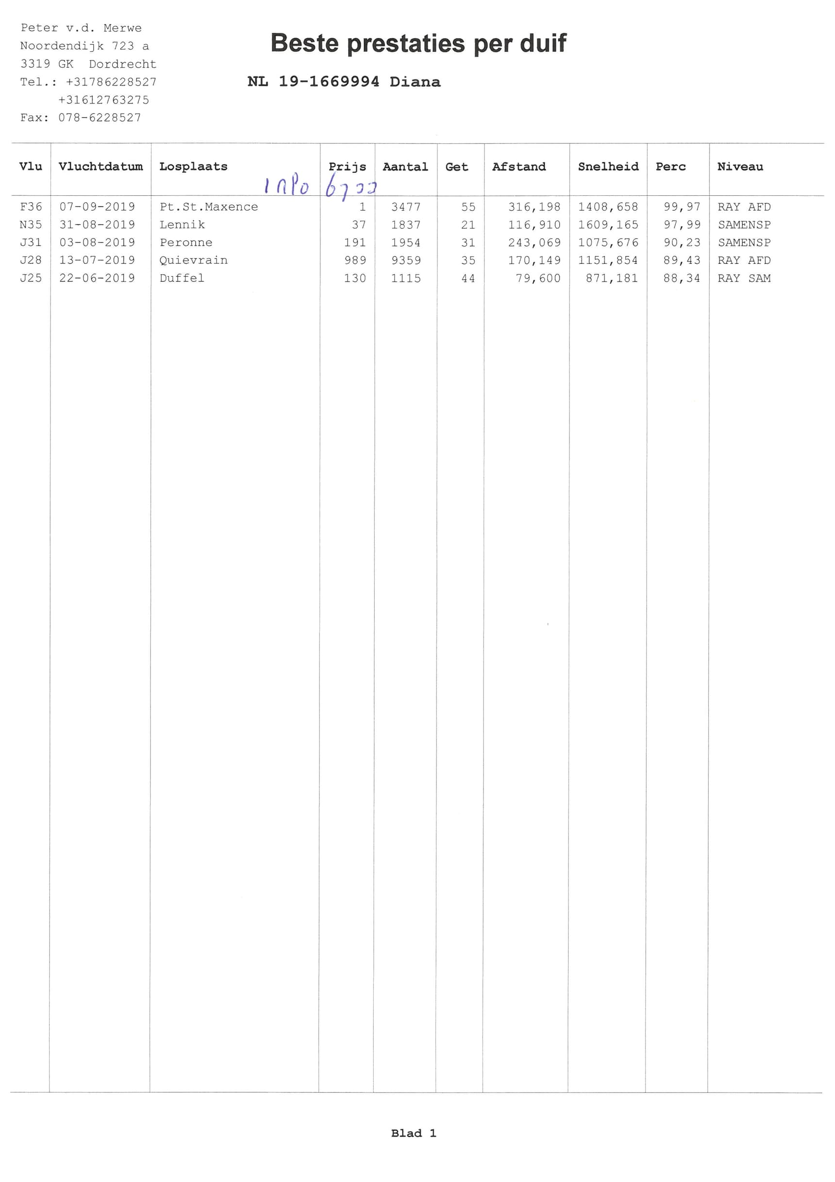 荣获: 凡特内 2,928羽1名 – 贝洛尼 579羽1名 - 道夫尔 530羽1名 – 贝洛尼 539羽1名 – 蓬图瓦兹1,596羽2名 – NPO 蓬图瓦兹 19,072羽3名 – 庞特4,519羽10名 – 魁夫兰 3,948羽10名 – 塞尚1,253羽10名