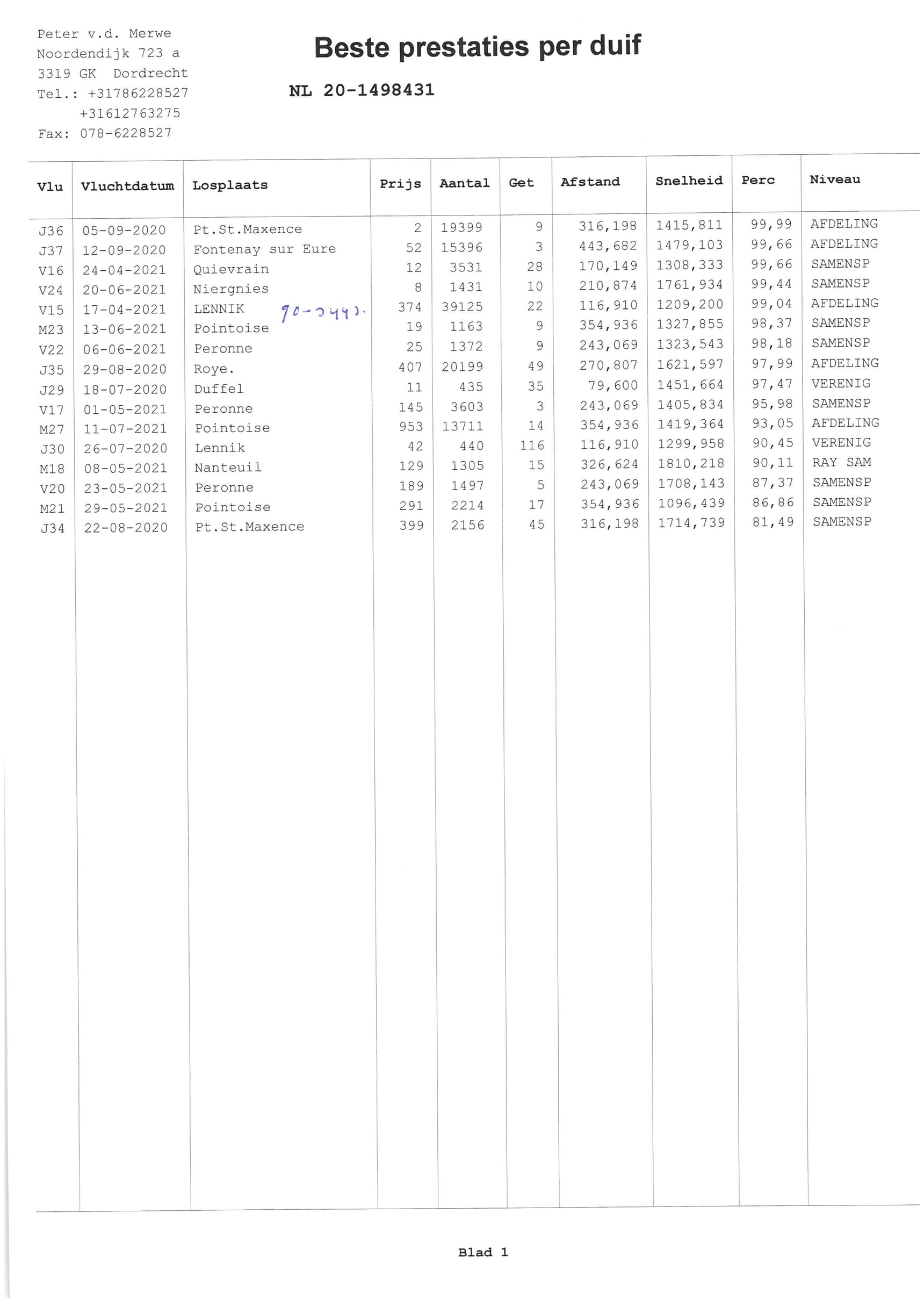 全平辈NL21-1196317荣获: 庞特 1,474羽36名 – 魁夫兰 2,624羽75名 - 摩林科 2,314羽138名 - NPO 南图 19,066羽188名