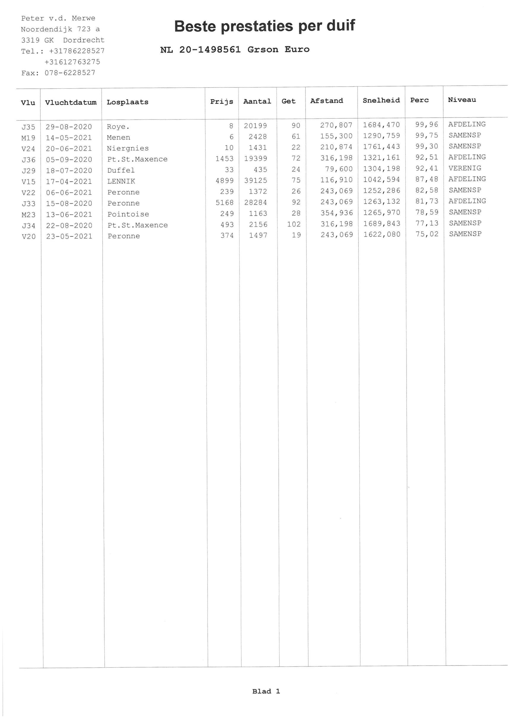 荣获: 西欧国家杯全能鸽王全国1位 – NPO皮赛佛 6,340羽1名 – NPO 拉苏特年 3,077羽1名 - NPO 查特鲁 2,227羽1名