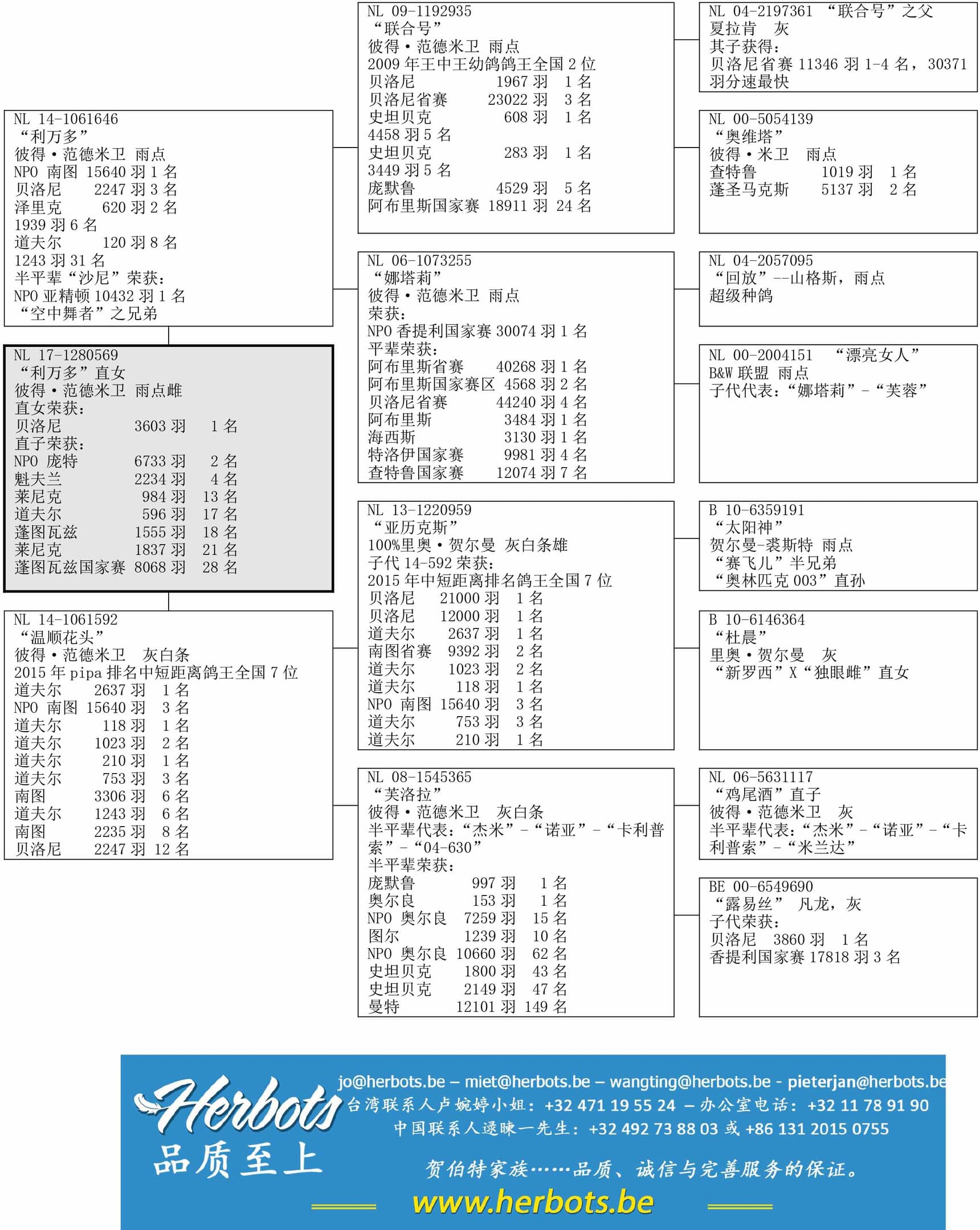 2019年鸽王全国4位 - NPO 庞特 6,711羽2名 (同舍鸽之后) - 魁夫兰 2,234羽4名 – 莱尼克 984羽13名 - 道夫尔 596羽17名 - 蓬图瓦兹 1,555羽18名 - 莱尼克 1,837羽21名 - 蓬图瓦兹国家赛 8,068羽28名