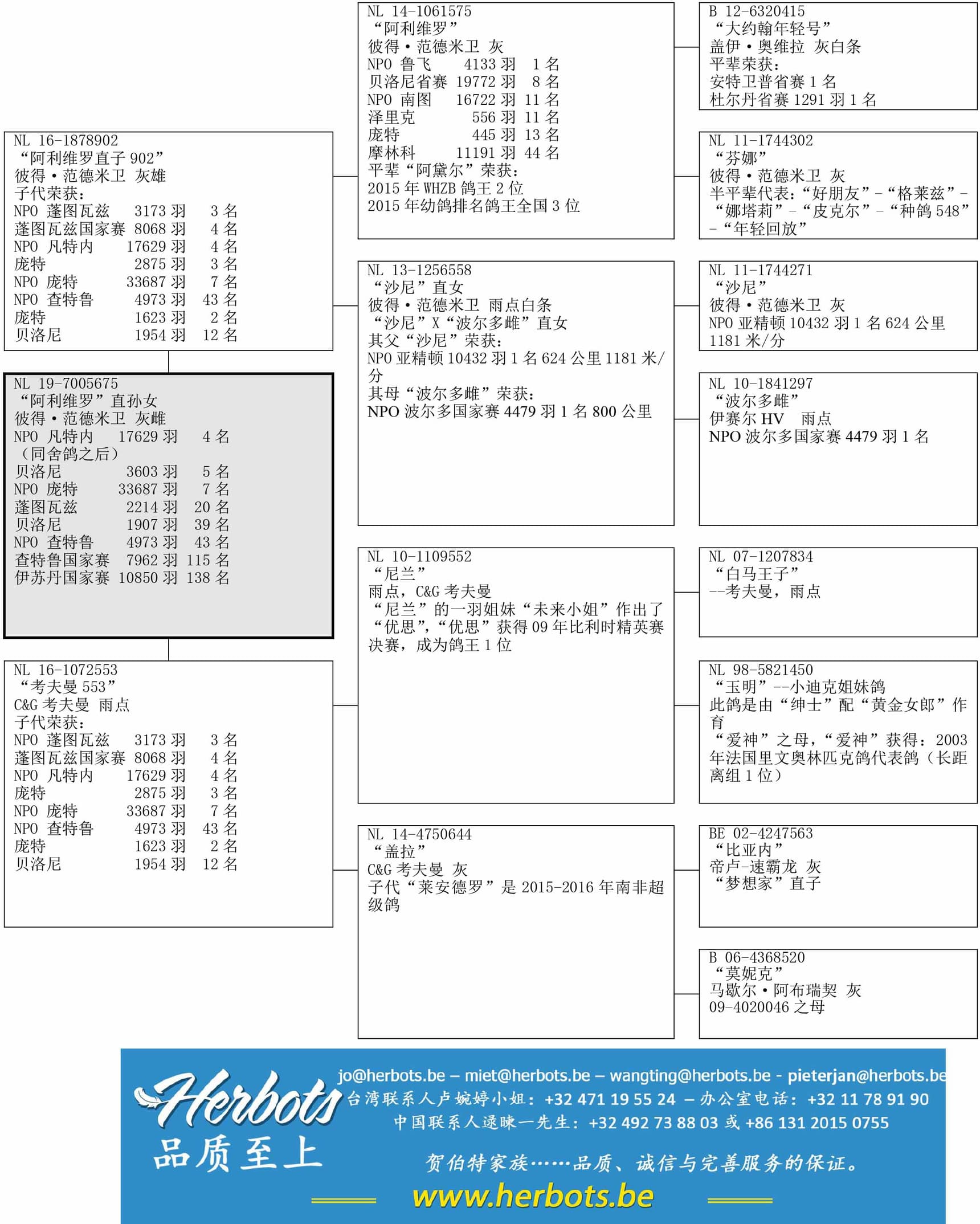 基础种鸽“阿利维罗” (NPO 鲁飞 4,133羽1名 – 贝洛尼省赛 19,772羽8名 – NPO 南图 16,722羽11名) x “莎妮直女” (出自NPO 亚精顿 10,432羽1名以及NPO 波尔多 4,479羽1名) 直子