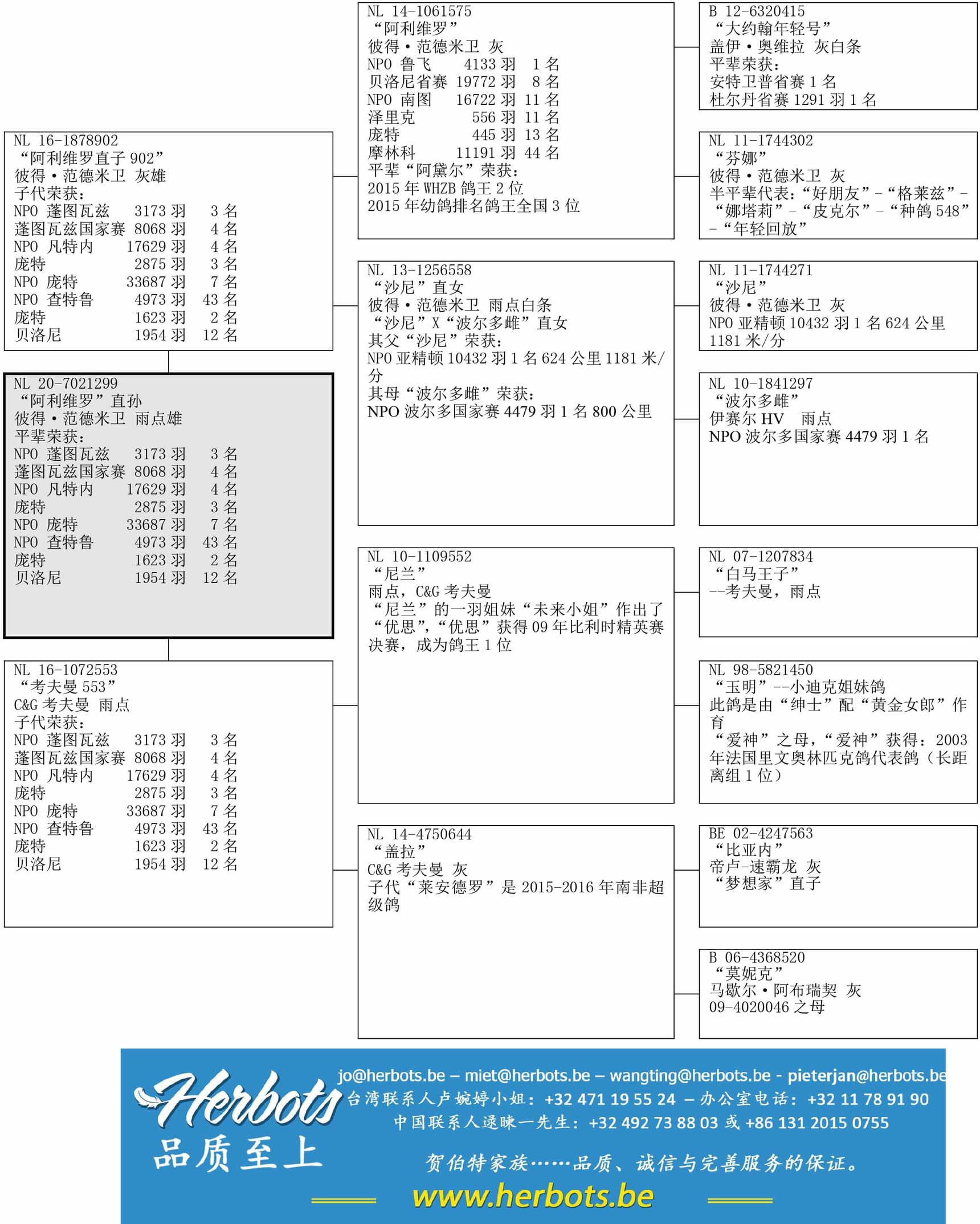 基础种鸽“阿利维罗” (NPO 鲁飞 4,133羽1名 – 贝洛尼省赛 19,772羽8名 – NPO 南图 16,722羽11名) x “莎妮直女” (出自NPO 亚精顿 10,432羽1名以及NPO 波尔多 4,479羽1名) 直子