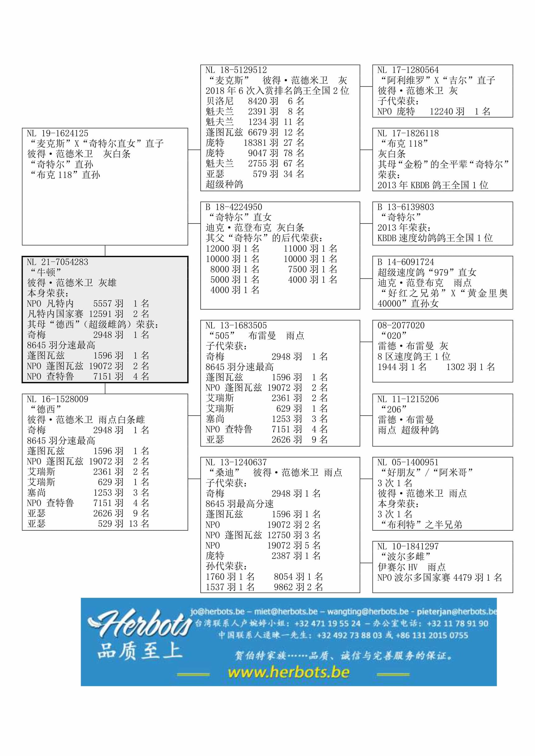 荣获: 奇梅1名 – 分速 8,645羽1名 – 蓬图瓦兹1,596羽1名 –NPO 19,072羽2名 – 艾瑞斯 629羽1名 - 艾瑞斯 2,361羽2名 – 查特鲁国家赛 7,151羽4名 - 亚瑟 2,626羽9名