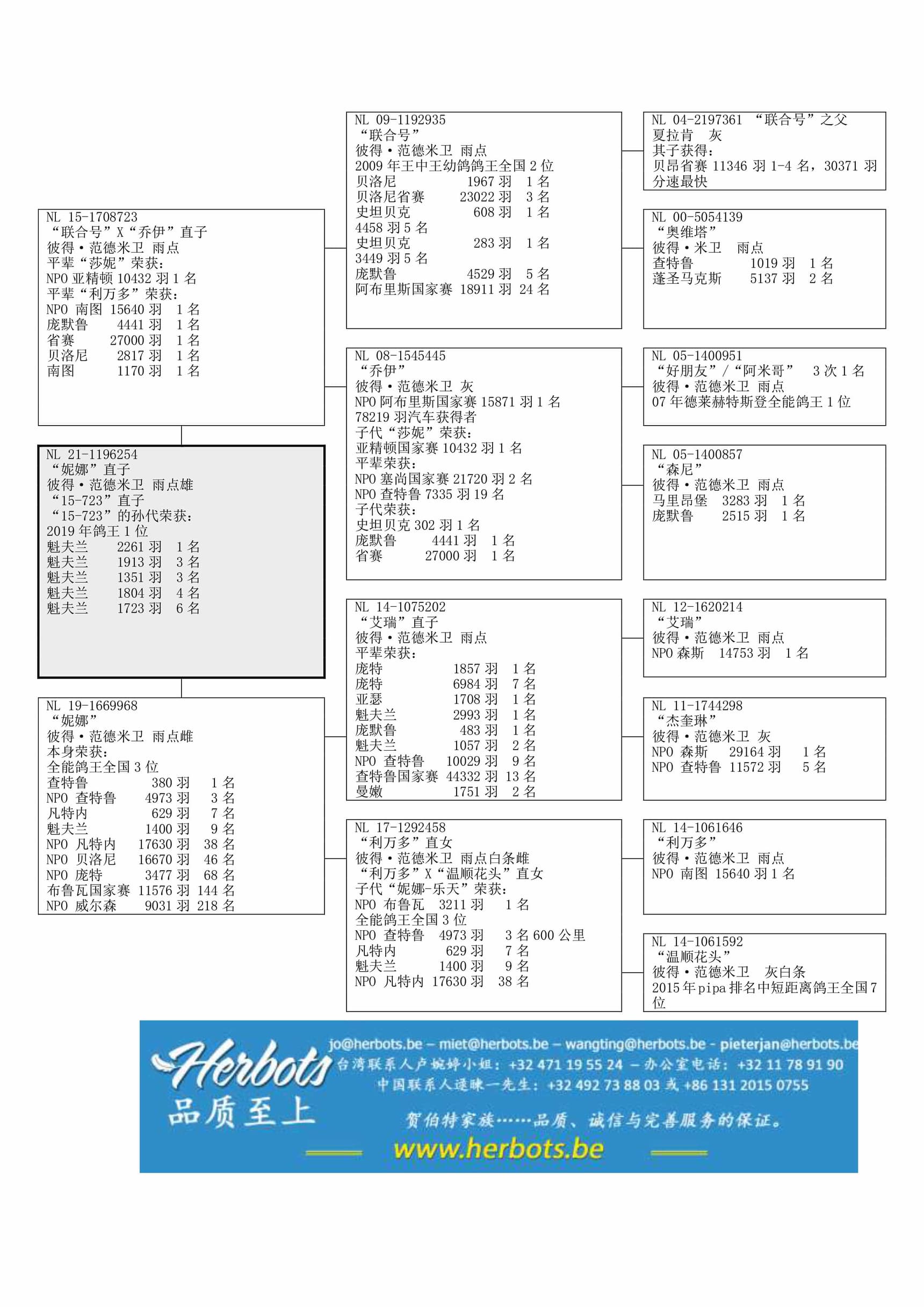 “利万多” (NPO 南图 15,640羽1名– 贝洛尼省赛 27,000羽1名) x “温顺花头”(15年鸽王全国7位) 直孙女