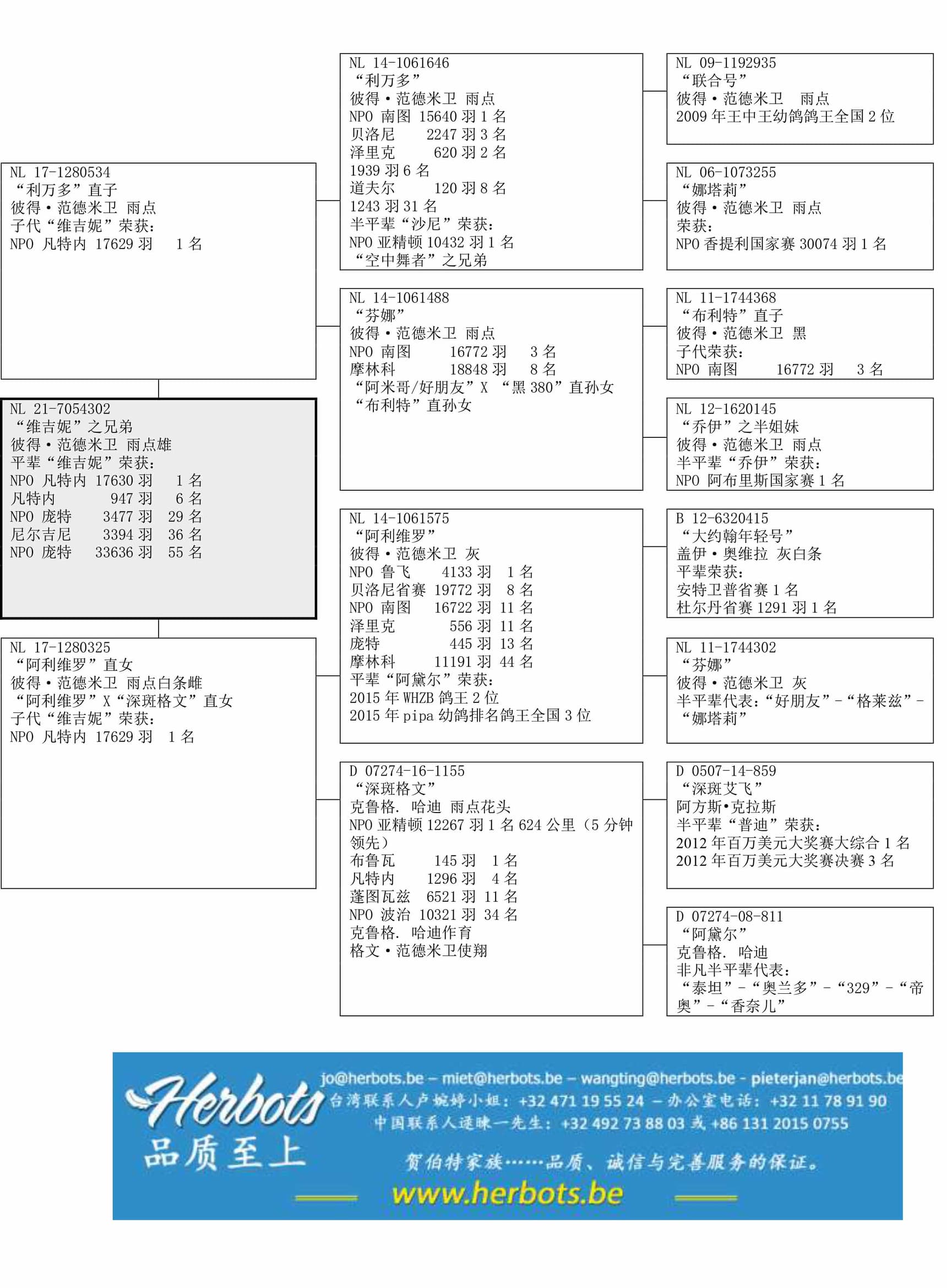 荣获: 亚精顿国家赛12,267羽1名–布鲁瓦 145羽1名–凡特内 1,296羽4名–蓬图瓦兹 6,521羽11名 – NPO 波治 10,321羽34名