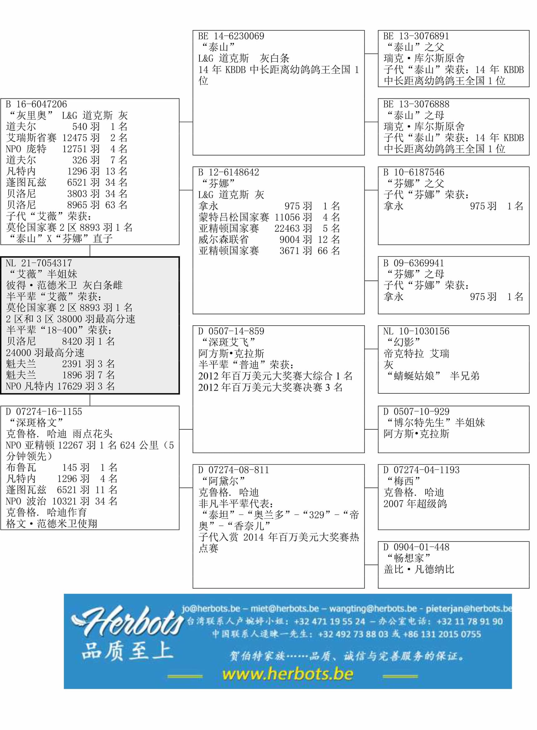 “泰山” (KBDB鸽王全国1位) x “芬纳”(蒙特吕松国家赛 11,056羽4名 – 亚精顿国家赛22,463羽5名 – 威尔森 9,004羽12名 – 亚精顿国家赛66名) 直子