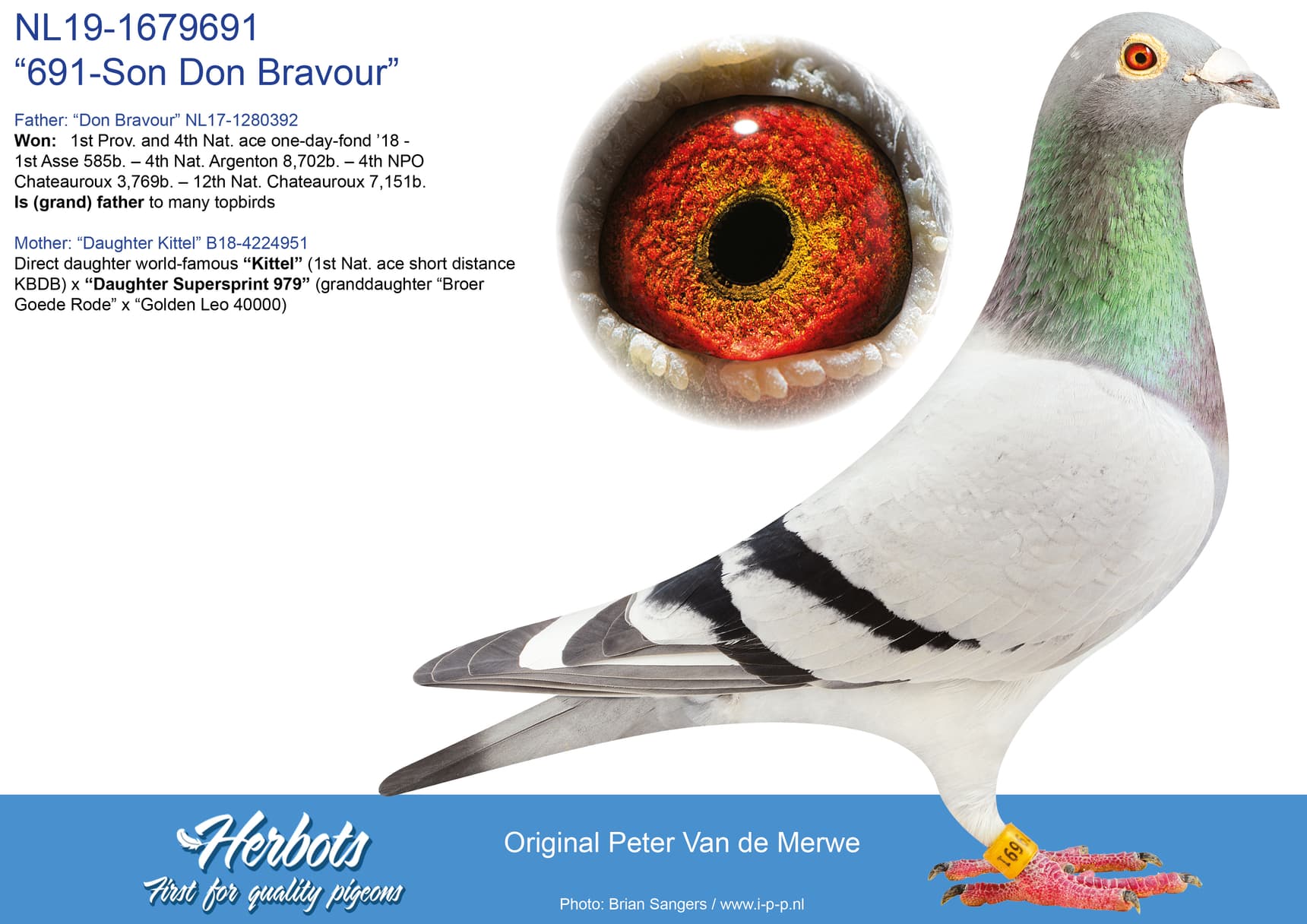 “勇敢号” (“勇敢号” 荣获14 次入赏 – 10次前1/10 - 6次前1/100 – 一日长距离鸽王省1位/全国4位 – 亚精顿国家赛 8,702羽4名 – 查特鲁国家赛 7,151羽12名) x “奇特尔直女” (其父“奇特尔”荣获:KBDB鸽王全国1位 – 范登布克) 作出