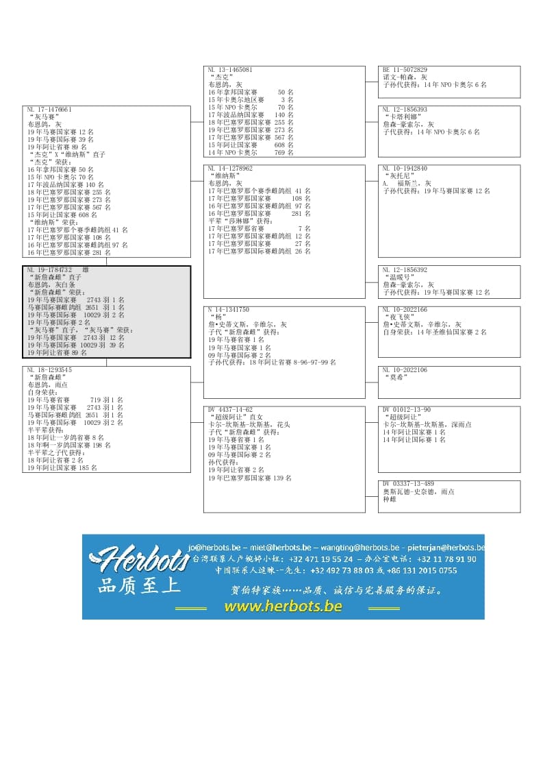 19年国际赛赢家直子父亲:NL 17-1476661“灰马赛”19年马赛国家赛883公里 2735羽12名国际赛 10029羽39名母亲:NL 18-1293545“新詹森雌”19年马赛国家赛883公里 2735羽1名国际赛雌鸽组 2651羽1名国际赛 10029羽2名