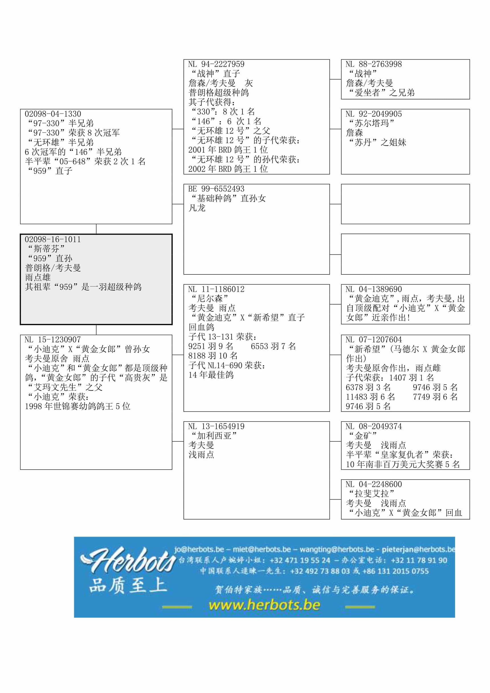 其祖辈“959”的子代代表及佳绩:基础种鸽 “无环雄” - “330” (8 次1名) -“146” (6 次1名)