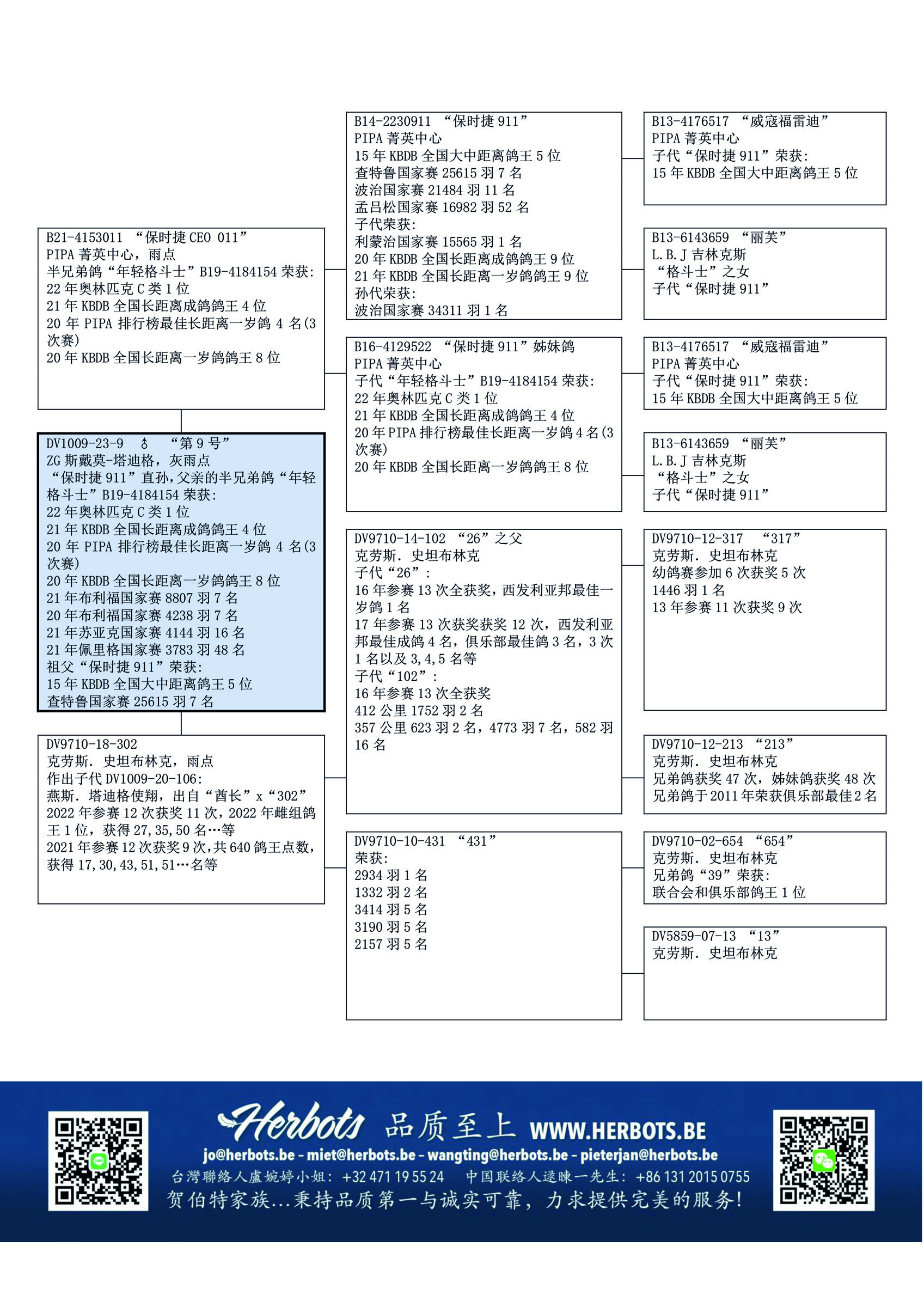 后代2代内荣获: 3次国家赛1名 –KBDB全国鸽王5位,7位,9位和9位