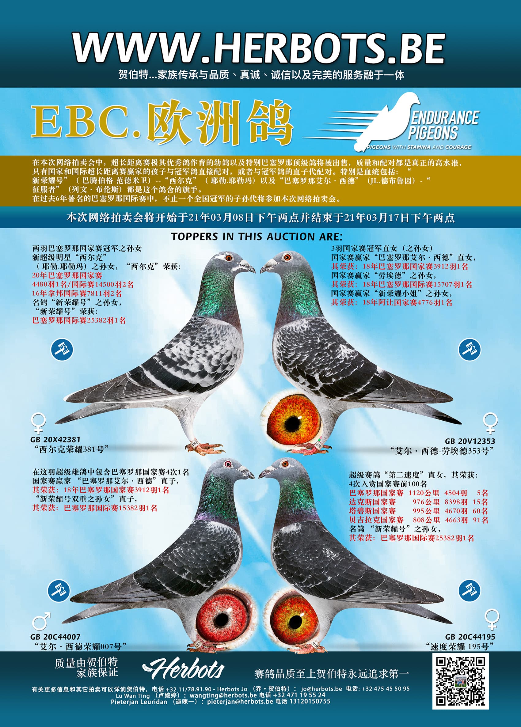 在本次网络拍卖会中,超长距离赛极其优秀鸽作育的幼鸽以及特别巴塞罗那顶级鸽将被出售,质量和配对都是真正的高水准,只有国家和国际超长距离赛赢家的孩子与冠军鸽直接配对,或者与冠军鸽的直子代配对。特别是血统包括:“新荣耀号”( 巴腾伯格-范德米卫)--“西尔克”( 耶勒.耶勒玛)以及“巴塞罗那艾尔·西德”(JL.德布鲁因)-“征服者”(列文·布伦斯)都是这个鸽舍的旗手。在过去6年著名的巴塞罗那国际赛中,不止一个全国冠军的子孙代将参加本次网络拍卖会。