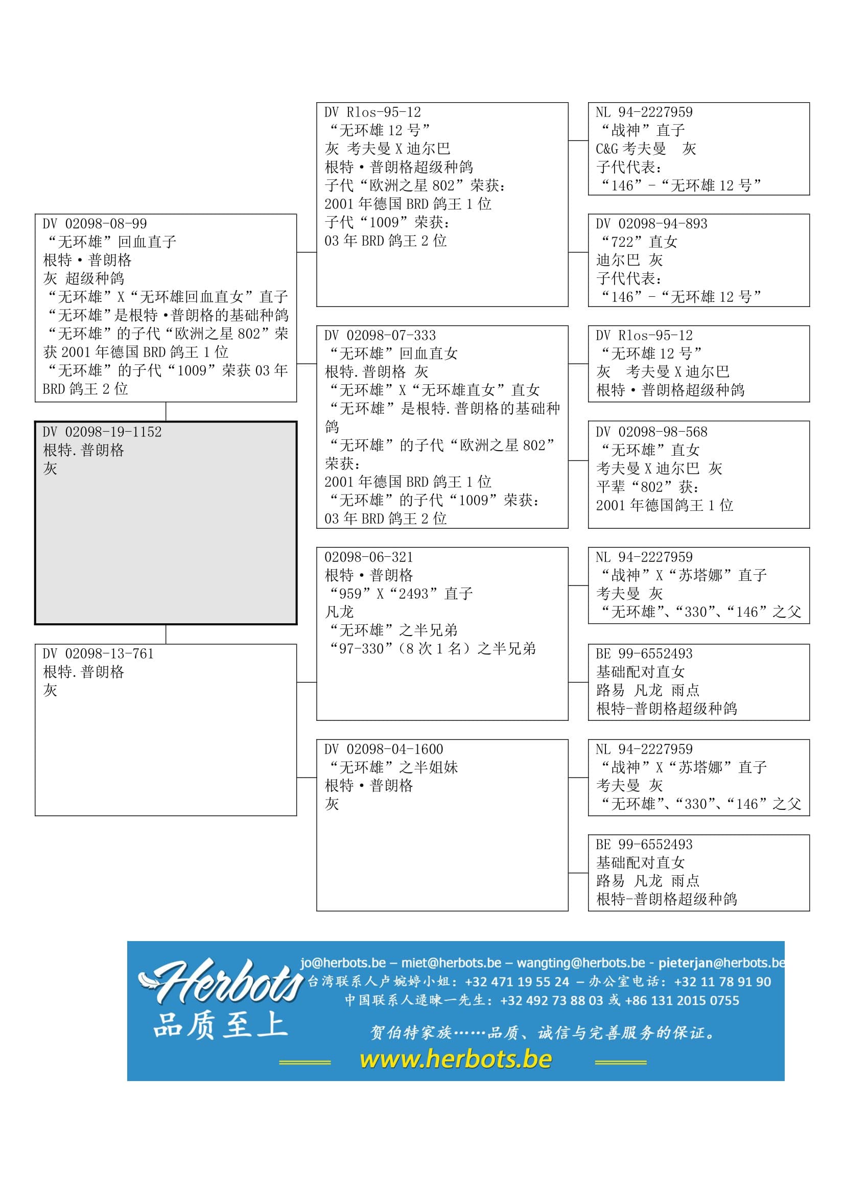 父亲: “无环雄直子” DV02098-08-99顶级种鸽“无环雄” x 他自己的直女作出“无环雄”是5年里3羽不同鸽王全国1位之父或祖父