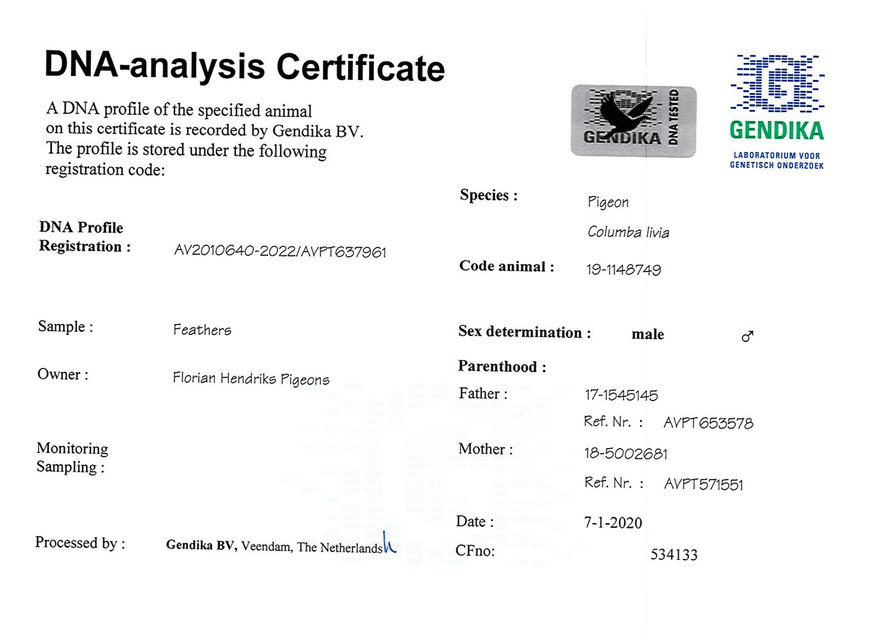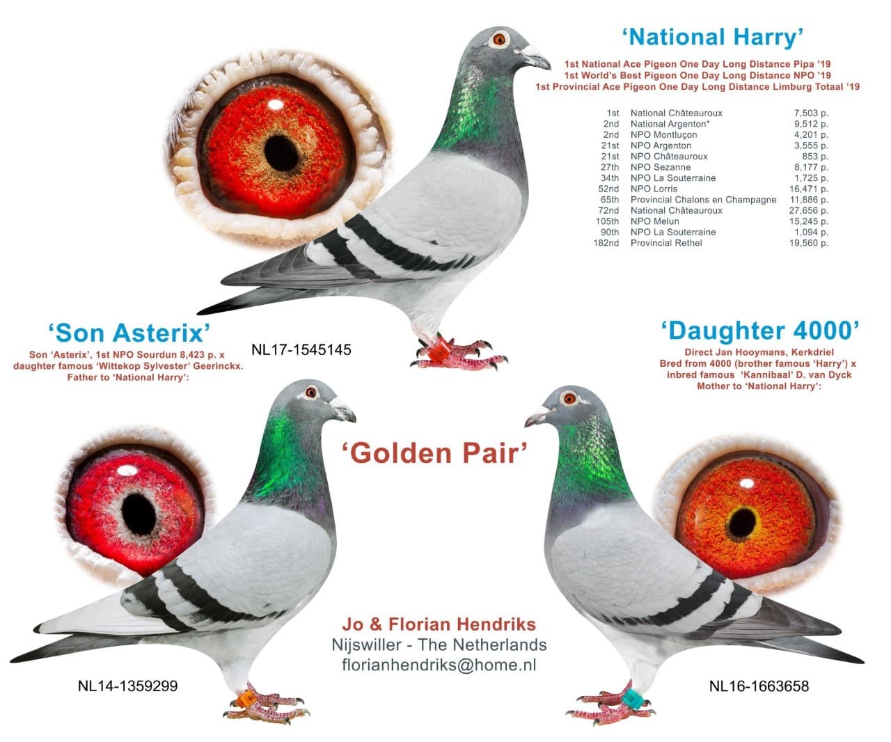 其父“全国哈利”荣获: 19年一日长距离鸽王全国1位,查特鲁国家赛 7,503羽1名 – 亚精顿国家赛 9,512羽2名– NPO 蒙特吕松4,201羽2名 – NPO 亚精顿 3,555羽21名