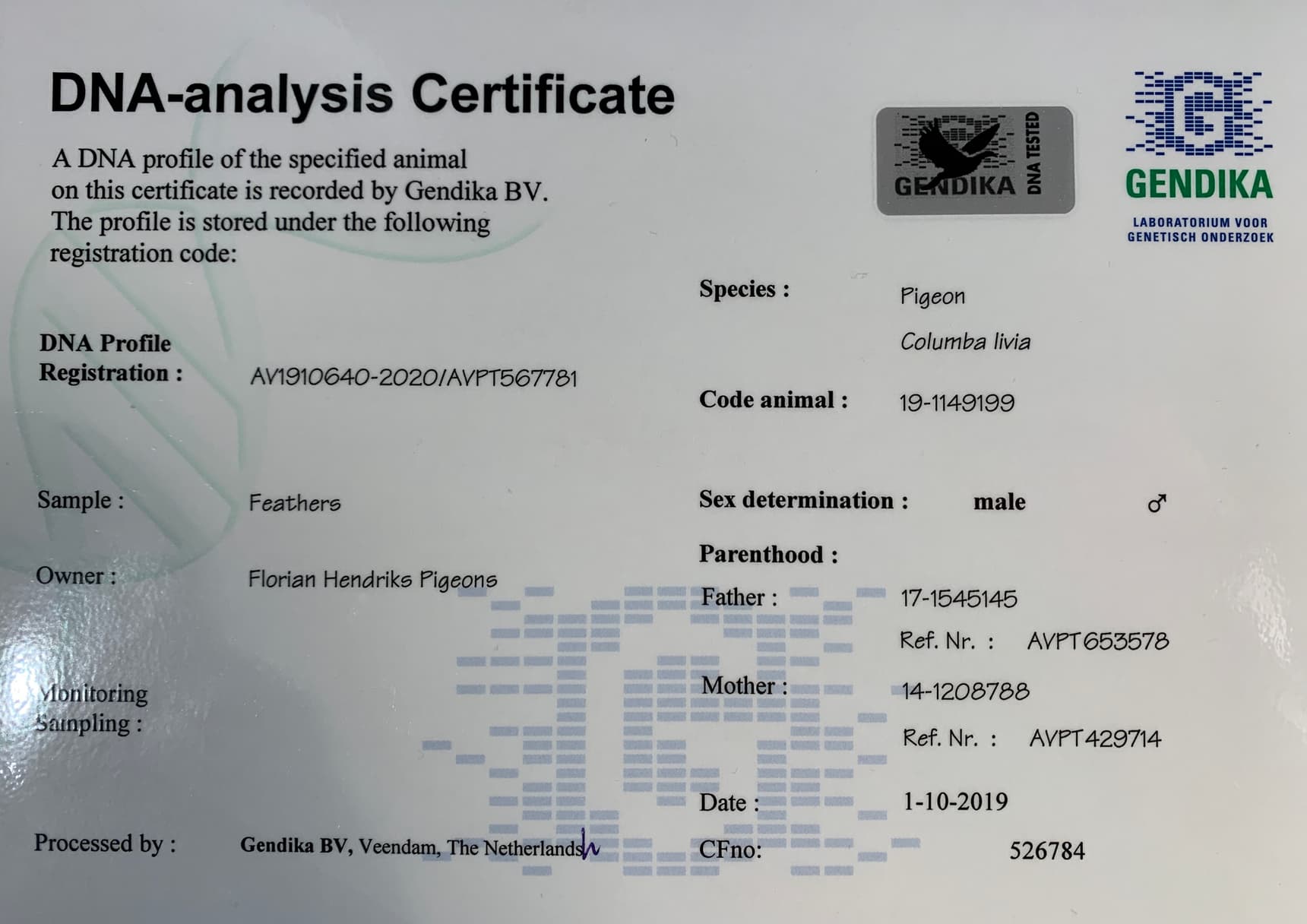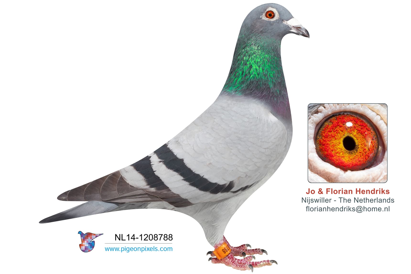 其父“全国哈利”荣获: 19年一日长距离鸽王全国1位,查特鲁国家赛 7,503羽1名 – 亚精顿国家赛 9,512羽2名– NPO 蒙特吕松4,201羽2名 – NPO 亚精顿 3,555羽21名