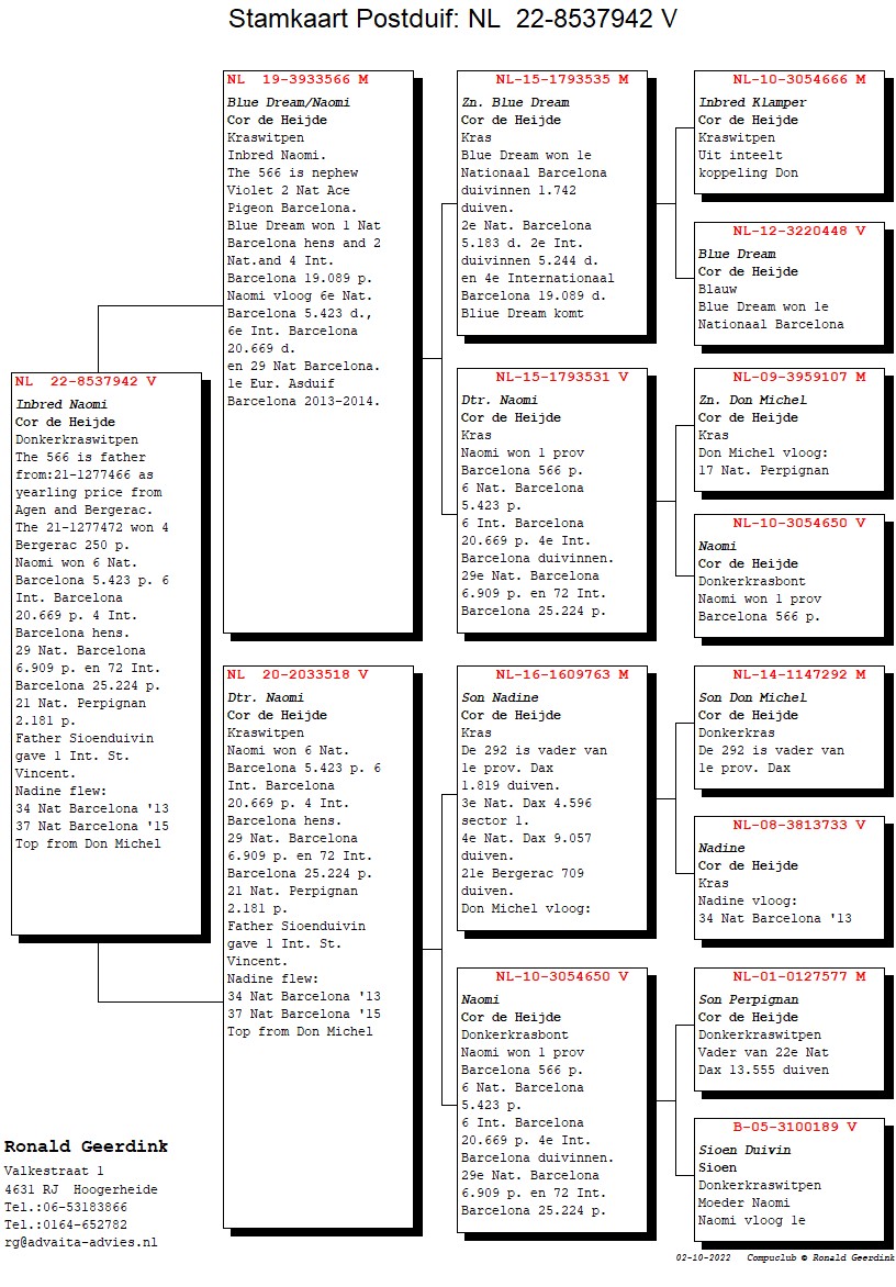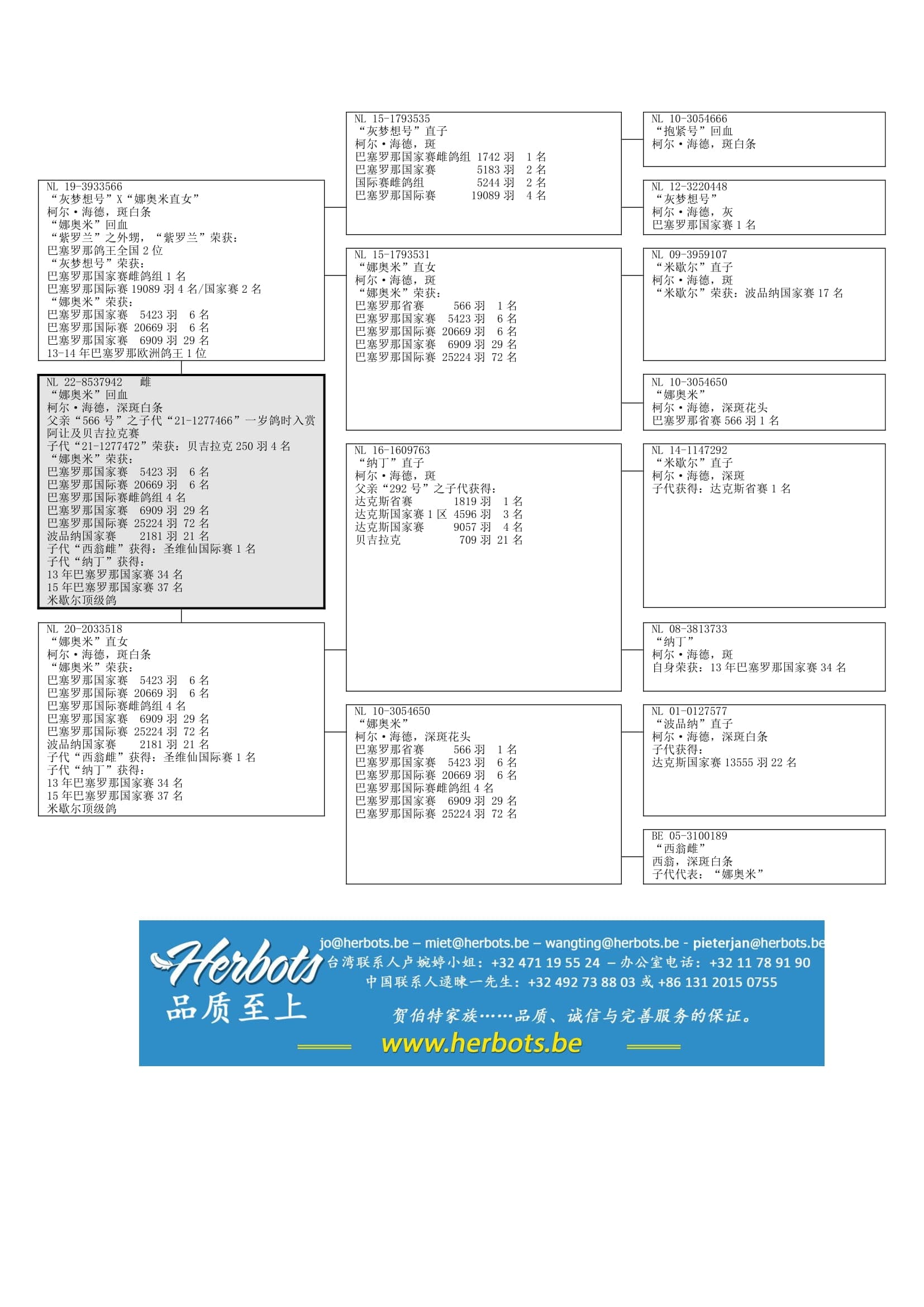 “灰梦想号直子” (“灰梦想号” 荣获:巴塞罗那国家赛雌鸽组1名--国际赛19089羽4名)x “娜奥米直女” (“娜奥米”荣获:两个赛季最佳巴塞罗那鸽;巴塞罗那国家赛29名-国际赛6名)作育