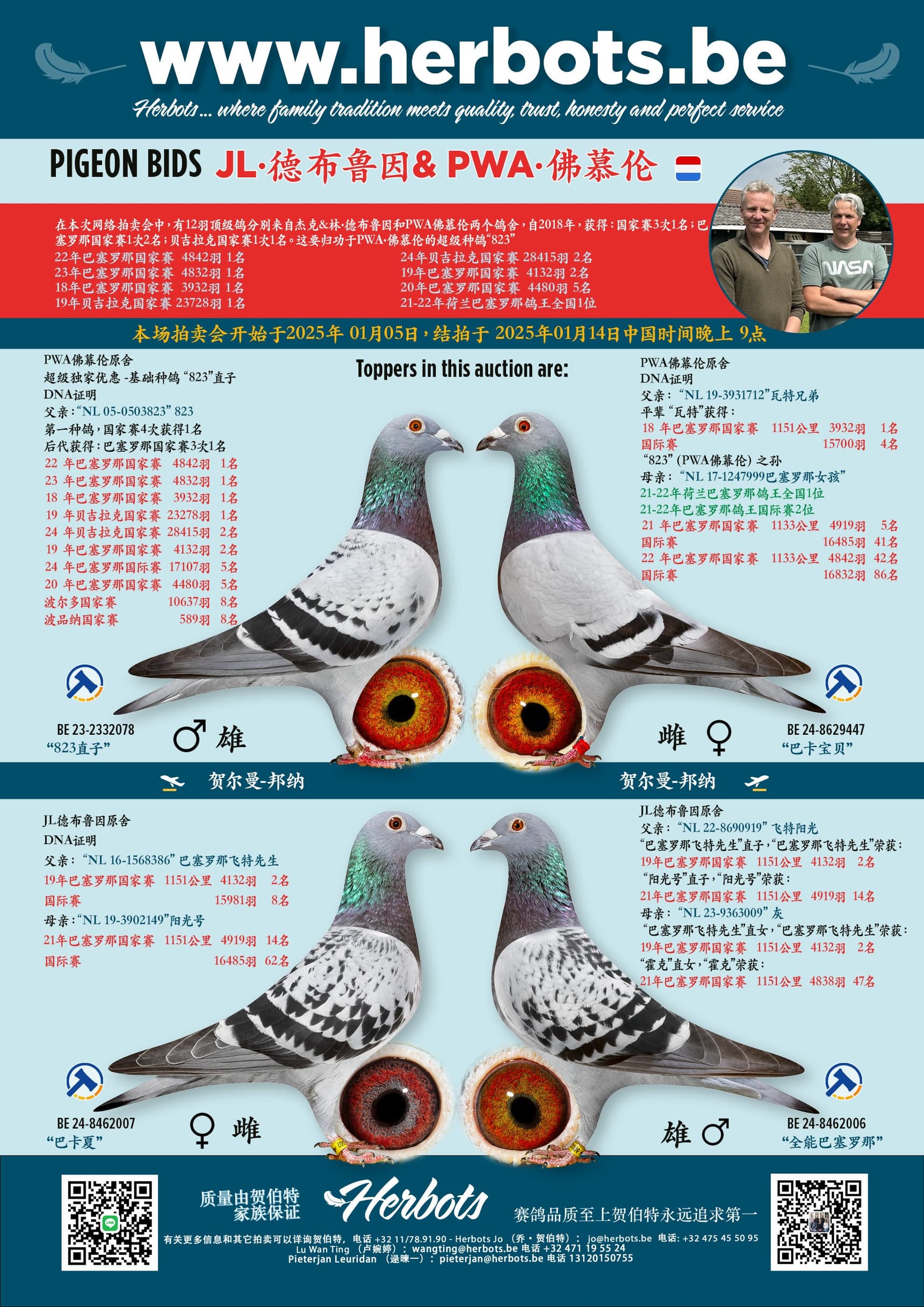 在本次网络拍卖会中,有12羽顶级鸽分别来自杰克&林·德布鲁因和PWA佛慕伦两个鸽舍,