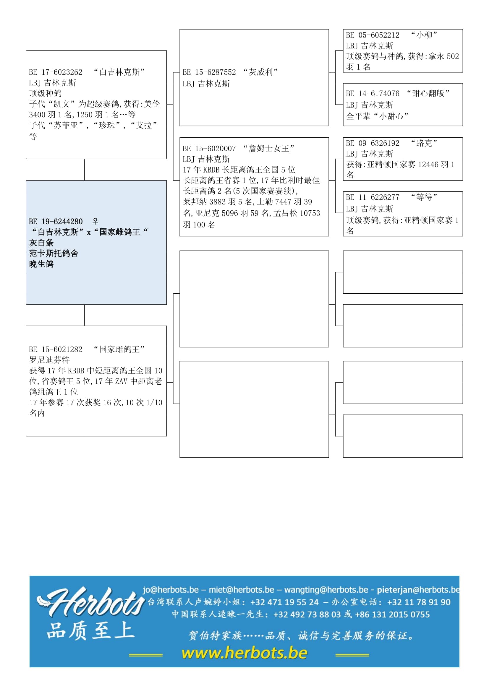 KBDB长距离鸽王全国5位 – 以5次国家赛赛绩获得比利时最优秀鸽2名– 4次国家赛前 100 名