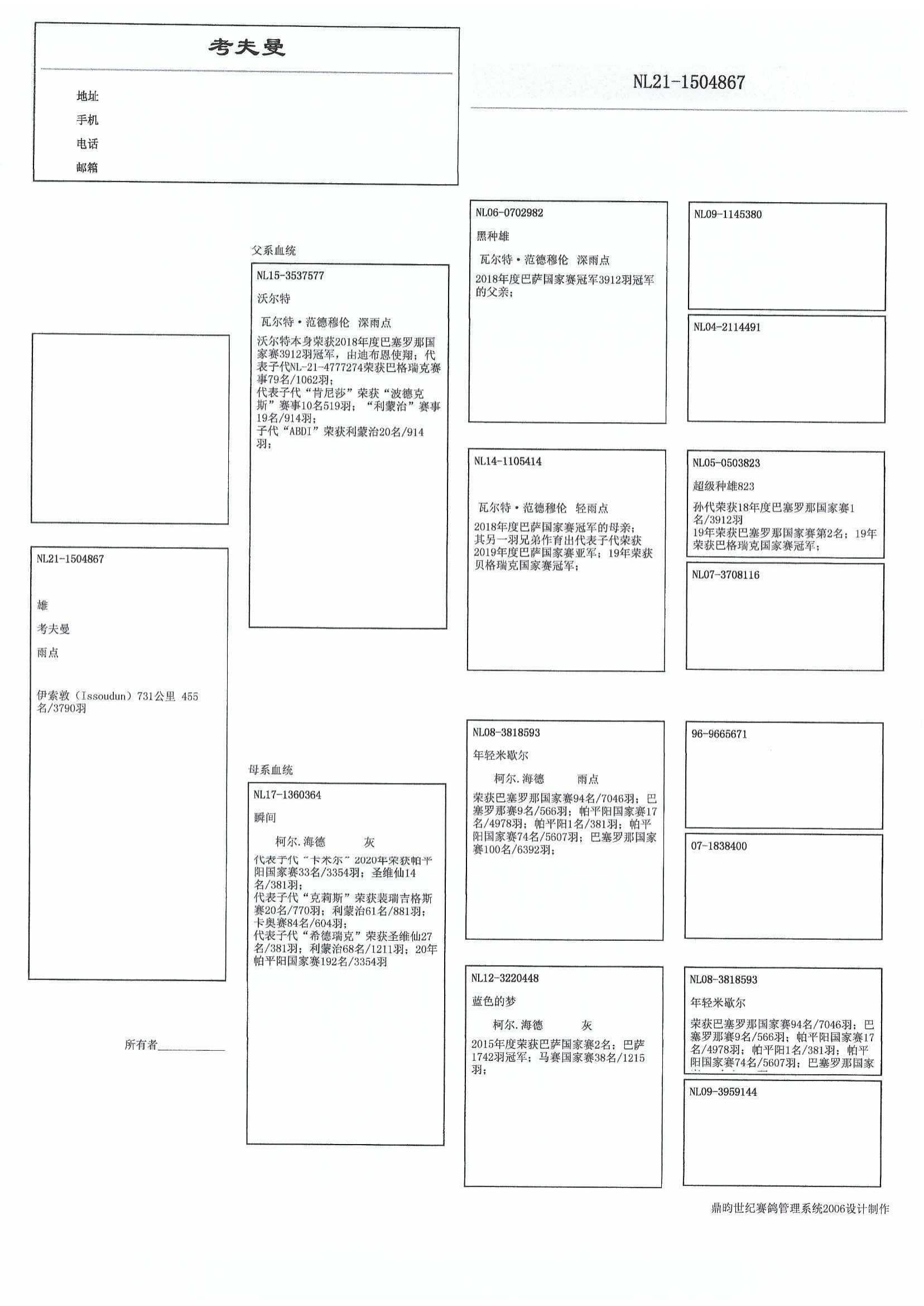 出自: “青年唐.米歇尔 ” (NL08-3818593) x “杰西的孙女” (赢得 13名 全国贝格瑞克 4,096羽)