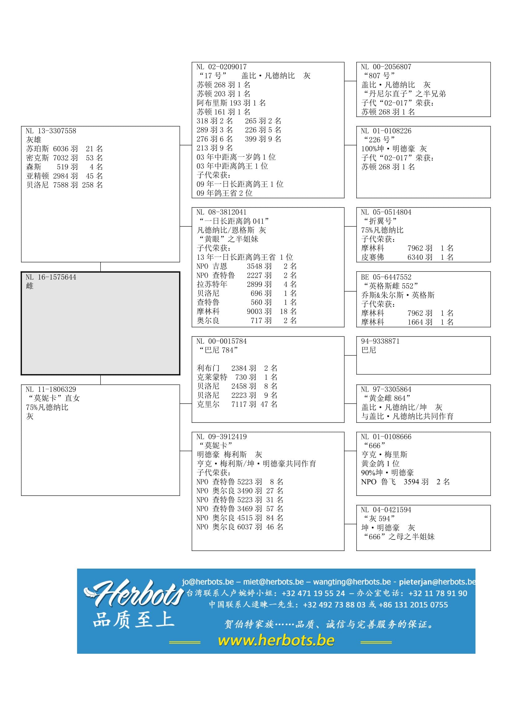 荣获:森斯 519羽4名 - 苏珀斯 6,036羽 21名 – 密克斯 7,032羽53名 – 亚精顿 2,984羽45名 – 贝洛尼 7,588羽258名