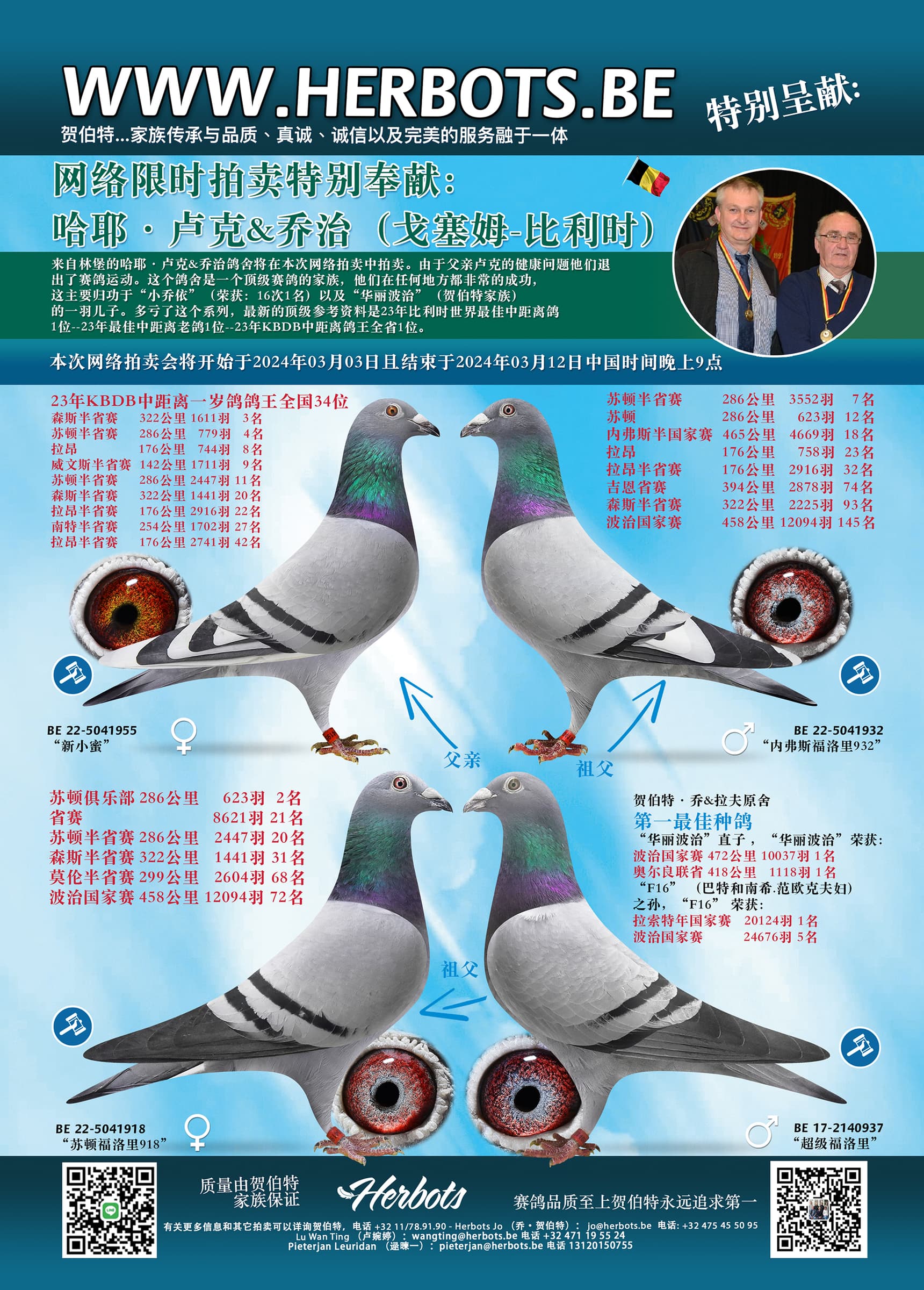 来自林堡的哈耶·卢克&乔治鸽舍将在本次网络拍卖中拍卖。由于父亲卢克的健康问题他们退出了赛鸽运动。这个鸽舍是一个顶级赛鸽的家族,他们在任何地方都非常的成功,这主要归功于“小乔依”(荣获:16次1名)以及“华丽波治”(贺伯特家族)的一羽儿子。多亏了这个系列,最新的顶级参考资料是23年比利时世界最佳中距离鸽1位--23年最佳中距离老鸽1位--23年KBDB中距离鸽王全省1位。