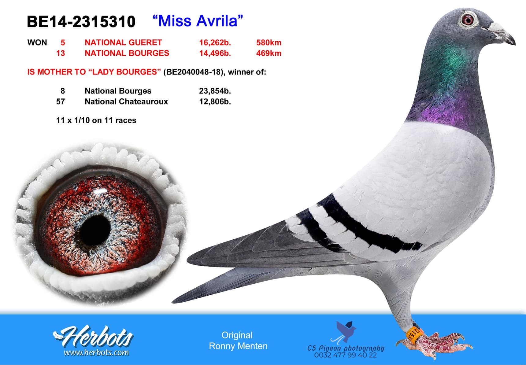 其母冠军雌鸽“艾薇拉小姐” 荣获: