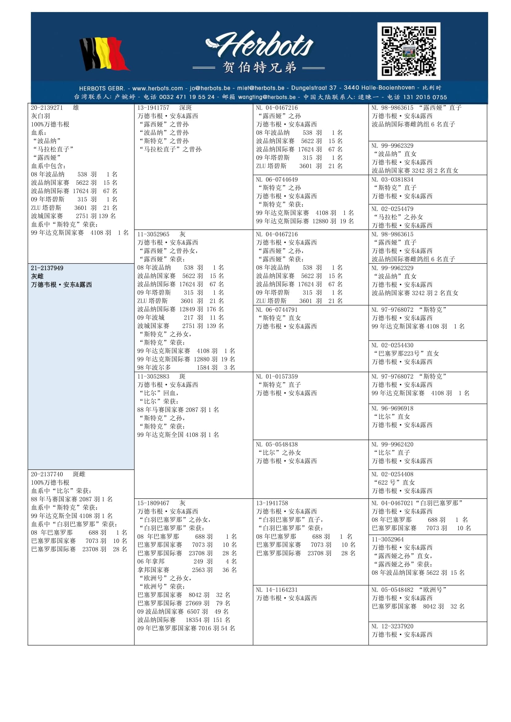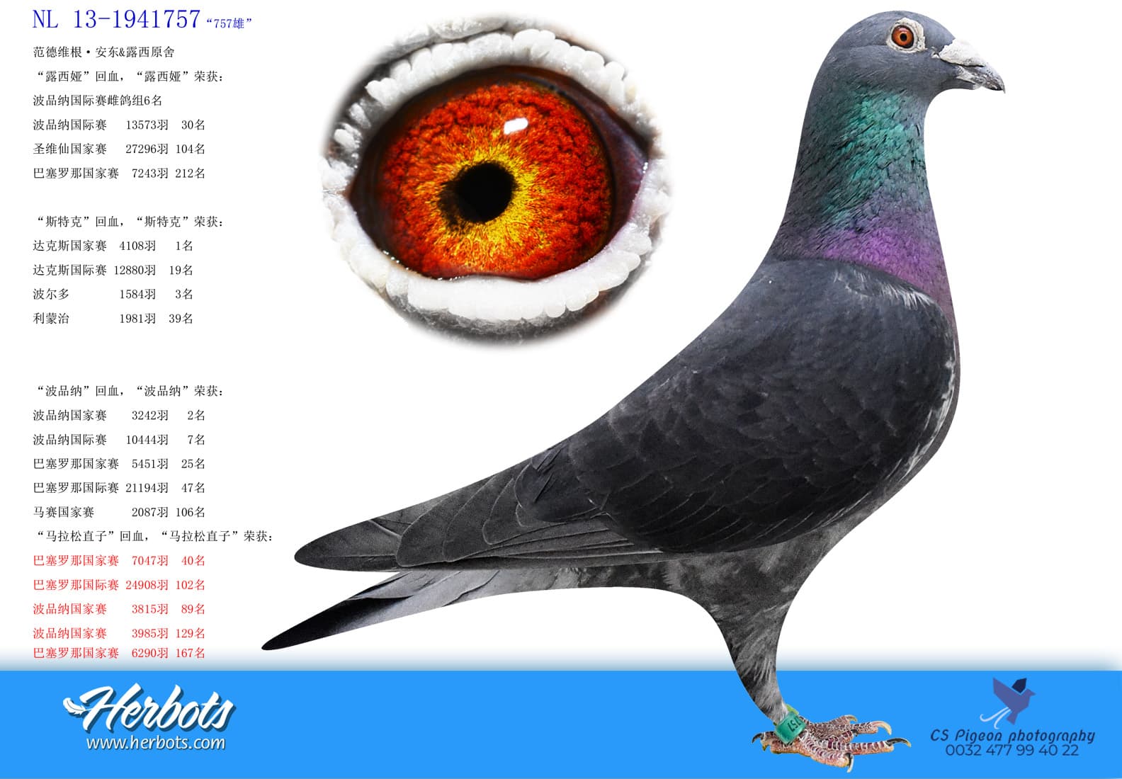 其祖辈“白羽巴塞罗那”荣获:巴塞罗那国家赛 7,073羽10名 – 巴塞罗那国际赛 23,708羽28名 – 拿邦国家赛 2,563羽36名