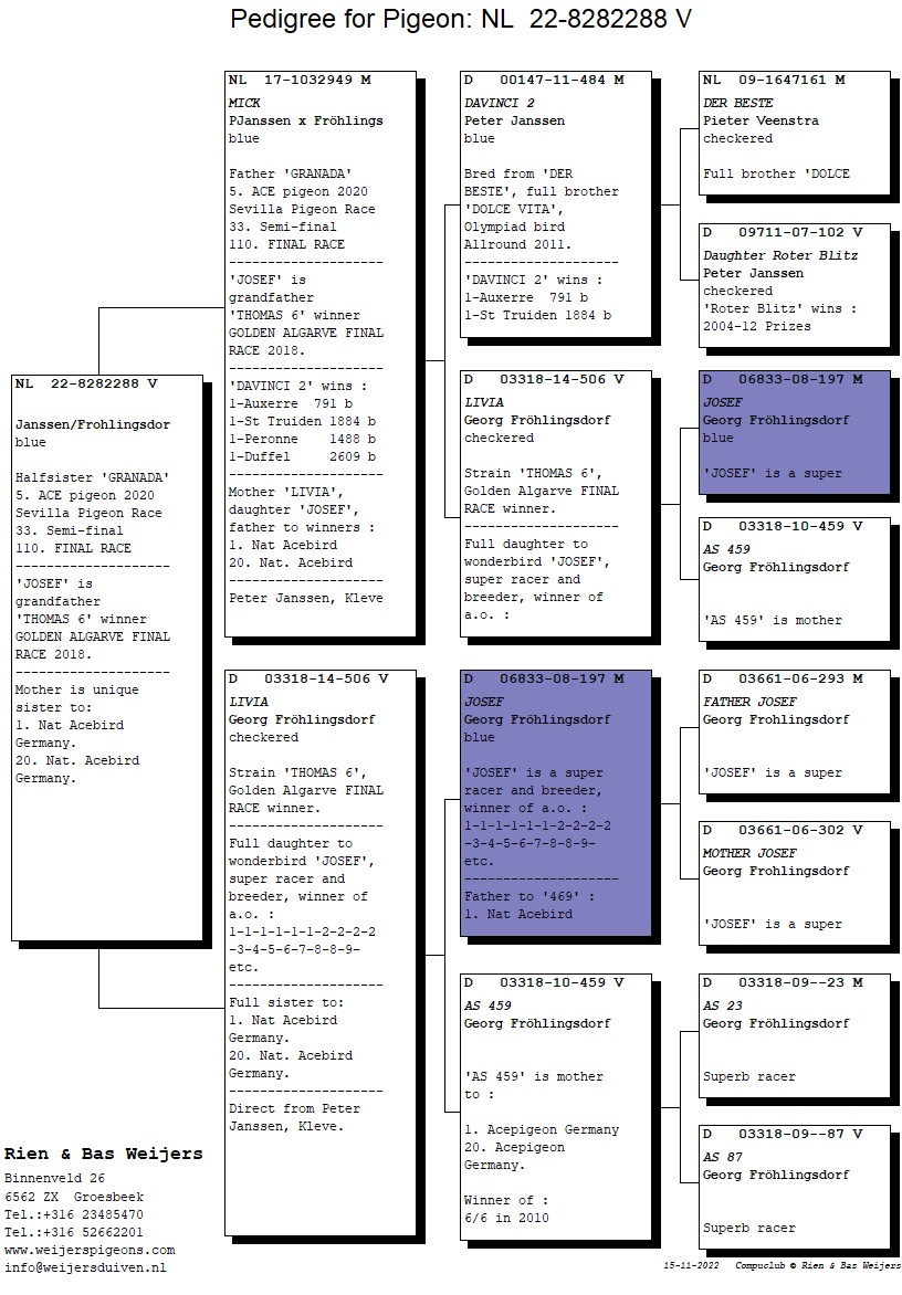 冠军鸽 “约瑟夫” (6 次1名) x “鸽王 459”直女