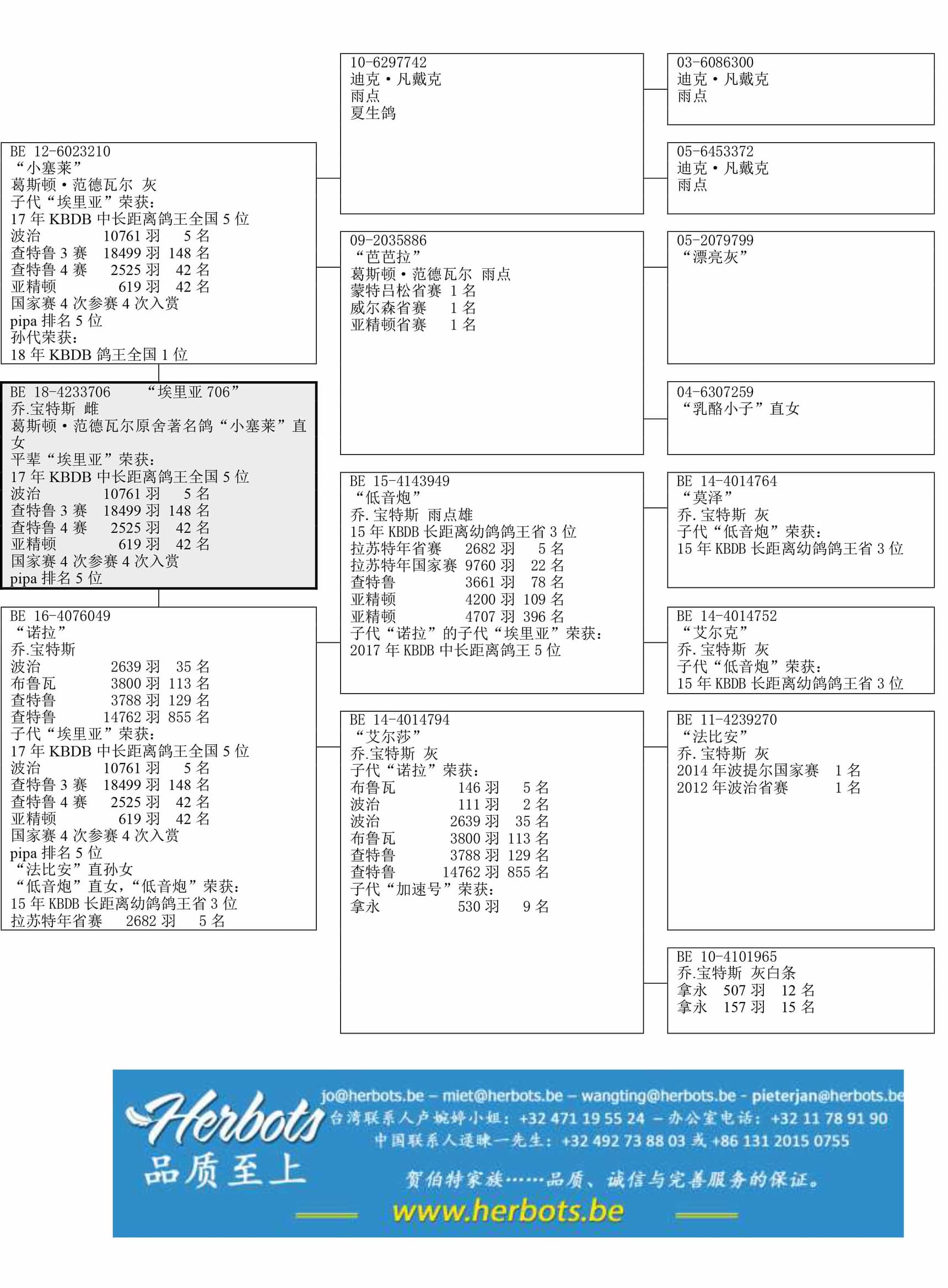 全平辈“埃里亚”荣获:17年KBDB幼鸽鸽王全国5位 - 波治国家赛区 10,761羽5名 – 亚精顿 619羽42名 -查特鲁 IV国家赛区 2,525羽42名– 查特鲁 III 国家赛 18,499羽148名