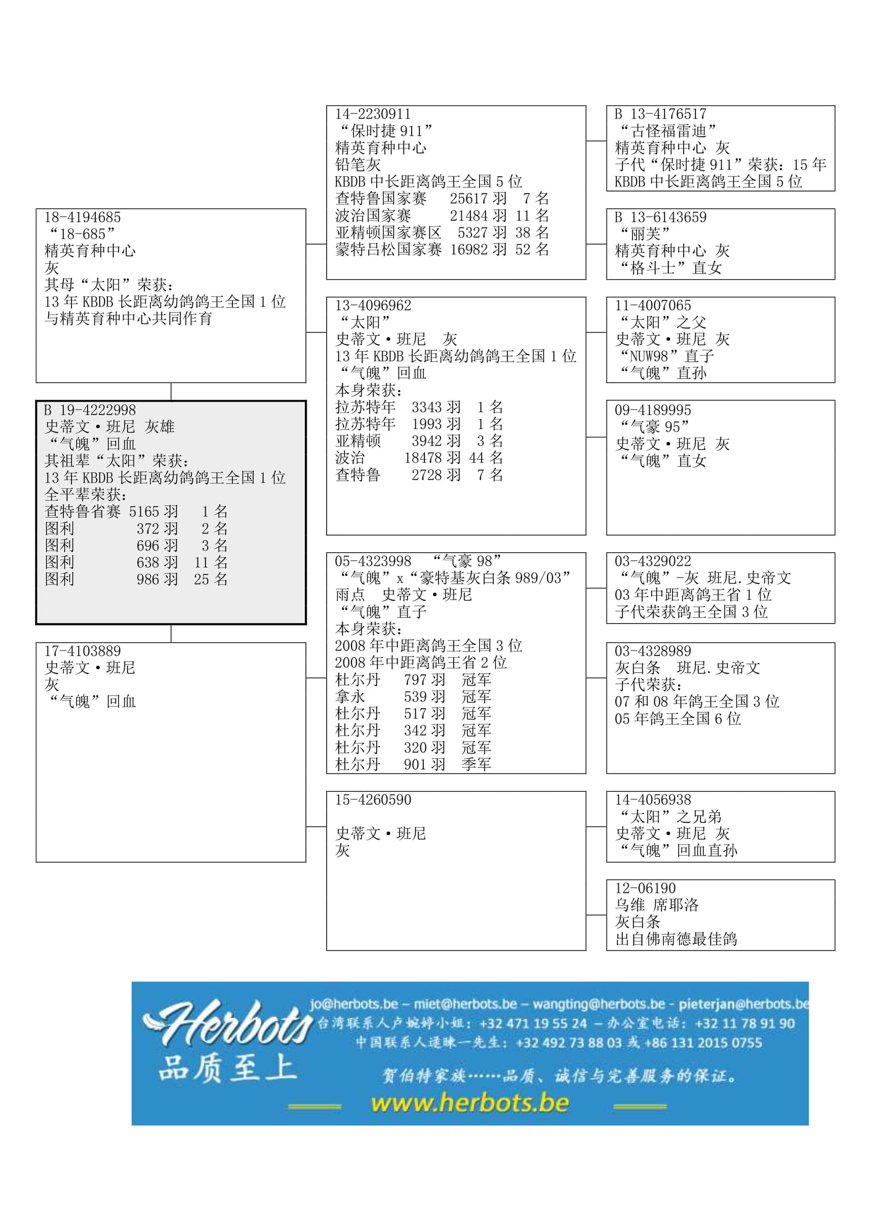 其祖辈 “太阳”荣获: 2013年KBDB中长距离幼鸽鸽王全国1位其祖辈 “保时捷 911”荣获: KBDB中长距离鸽王全国5位其祖辈 “气豪 98”荣获: 08年KBDB中距离鸽王省3位