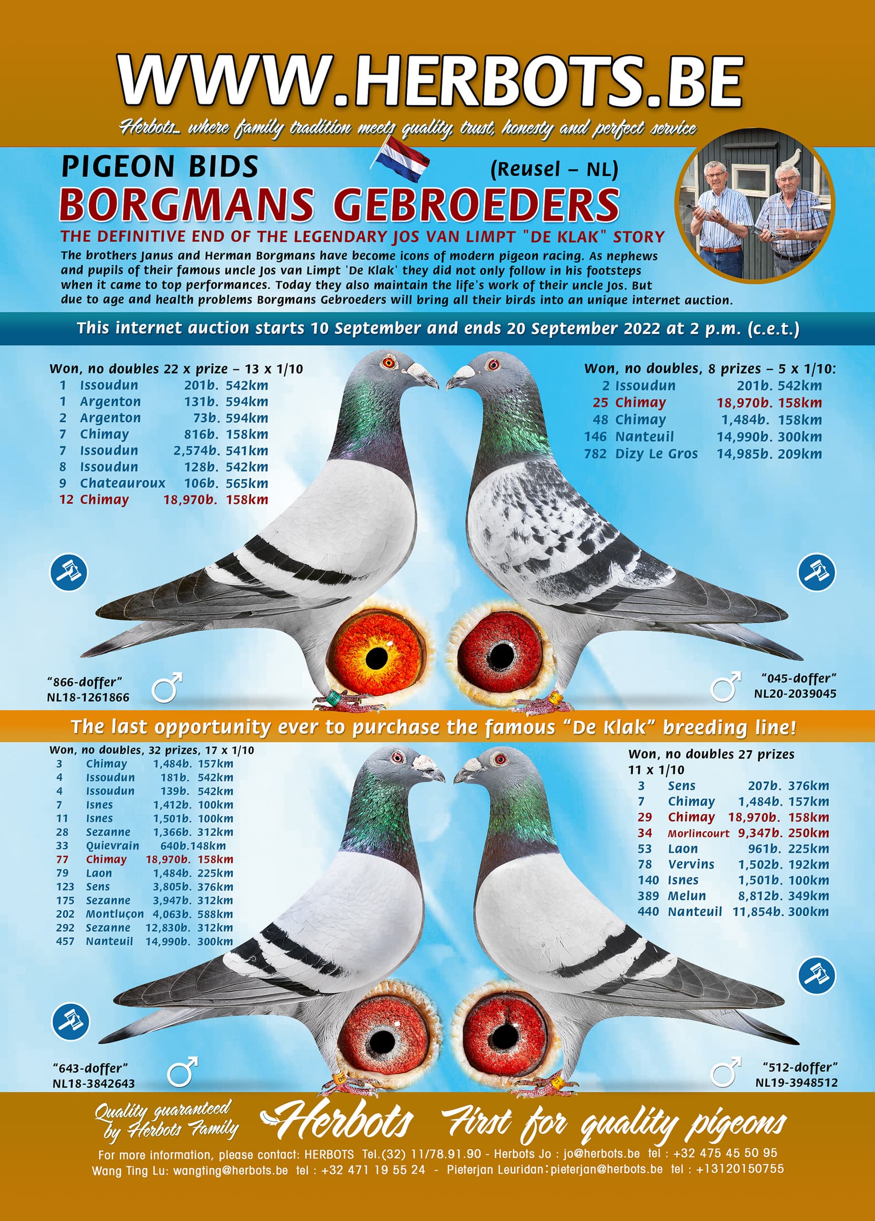 重要消息:伯格曼兄弟只会保留一些鸽子家飞。伯格曼兄弟对贺伯特家族作出了保证永远不会卖那些鸽子。本场拍卖会是最后一次机会从伯格曼兄弟直接买到信鸽!