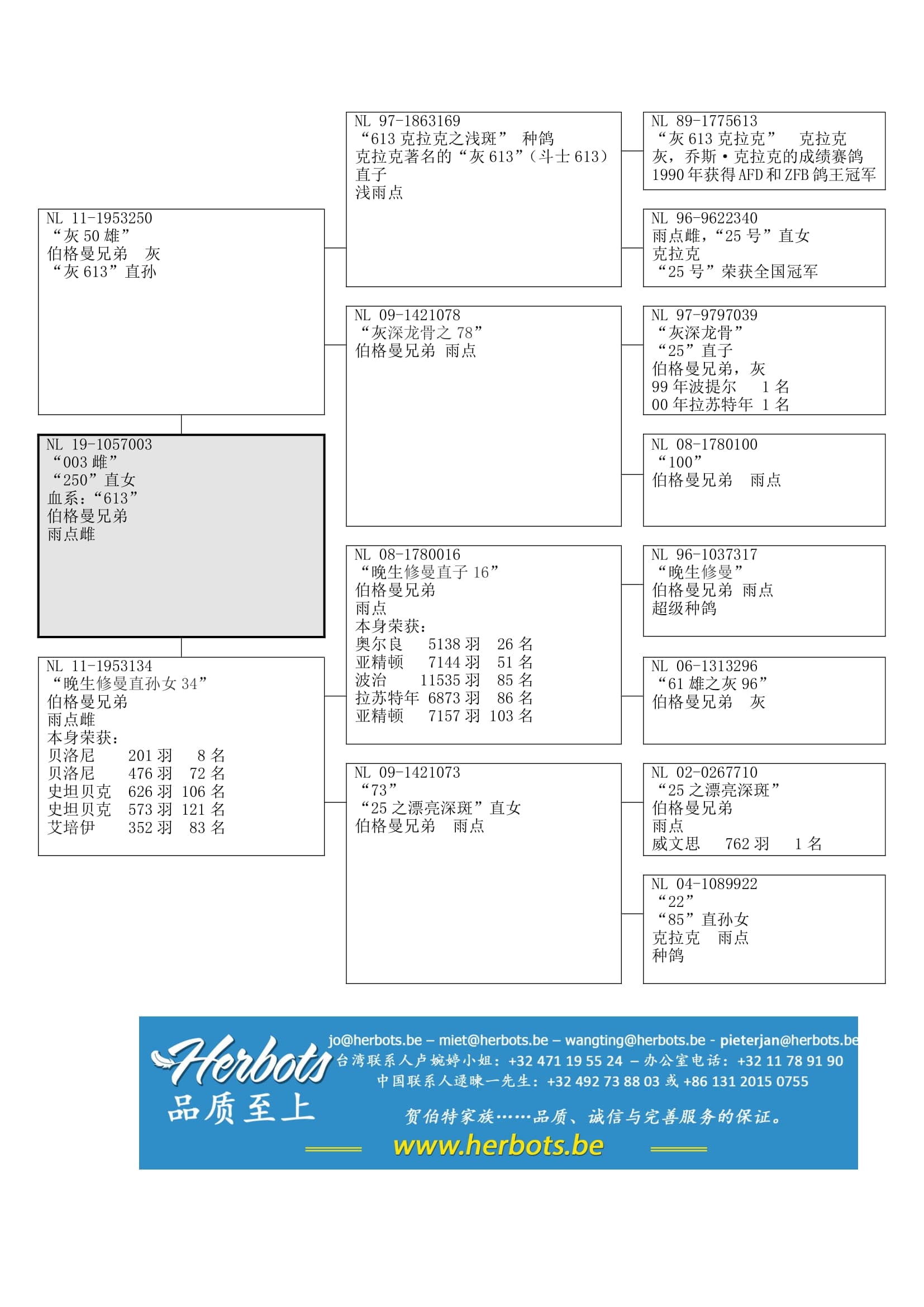 其父“晚生修曼直子16”荣获:奥尔良 5,138羽26名 – 亚精顿 7,144羽51名 – 波治11,535羽85名 – 拉苏特年 6,873羽86名