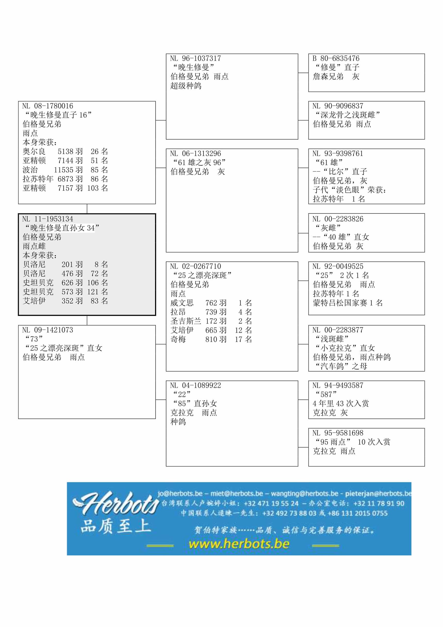 其父“晚生修曼之16雄”荣获:奥尔良 5,138羽26名 – 亚精顿 7,144羽51名 – 波治11,535羽85名 – 拉苏特年 6,873羽86名
