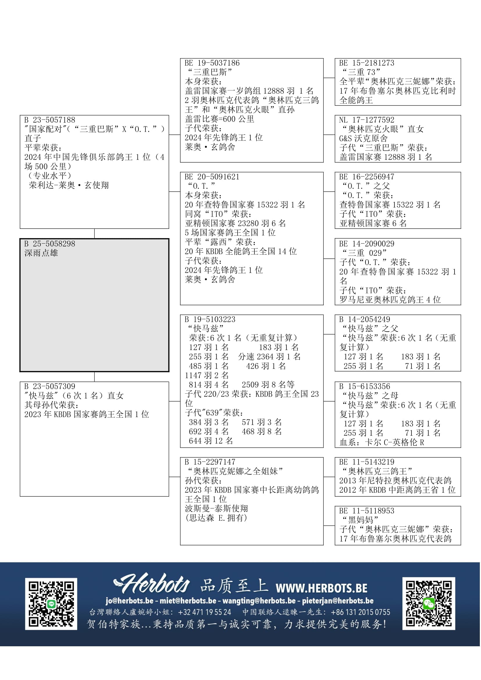 “快马兹” (6 次1名;子代荣获: KBDB鸽王全国23位) x “B15-2297147” (“奥林匹克妮娜”之全姐妹- 孙代荣获:23年KBDB幼鸽鸽王全国1位 @ 波斯曼-泰斯使翔)作出