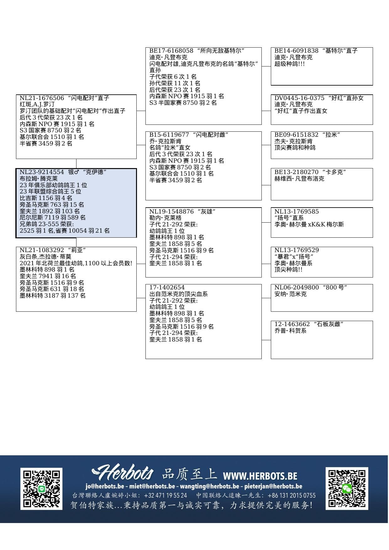 杰夫・克拉斯肯(比利时)荣获:KBDB 2022年KBDB全省中距离幼鸽鸽王2位,2023年荣获:拉昂2,760羽1名.全兄弟鸽荣获2023年KBDB全国全能幼鸽鸽王25位!