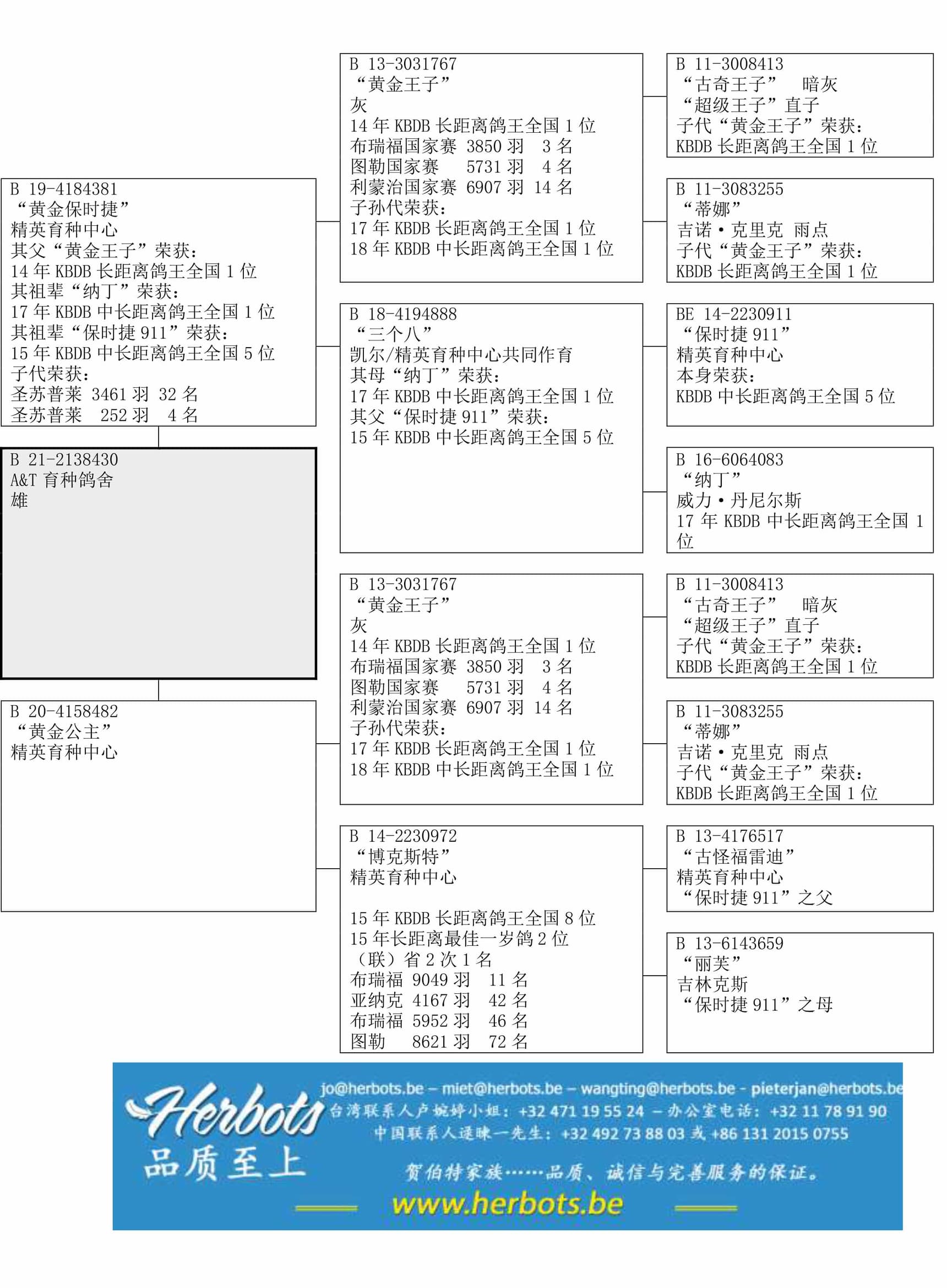 荣获: 14年KBDB长距离鸽王全国 1位 - 布瑞福国家赛3,850羽3名 – 图勒国家赛 5,731羽4名 – 利蒙治国家赛 6,907羽14名
