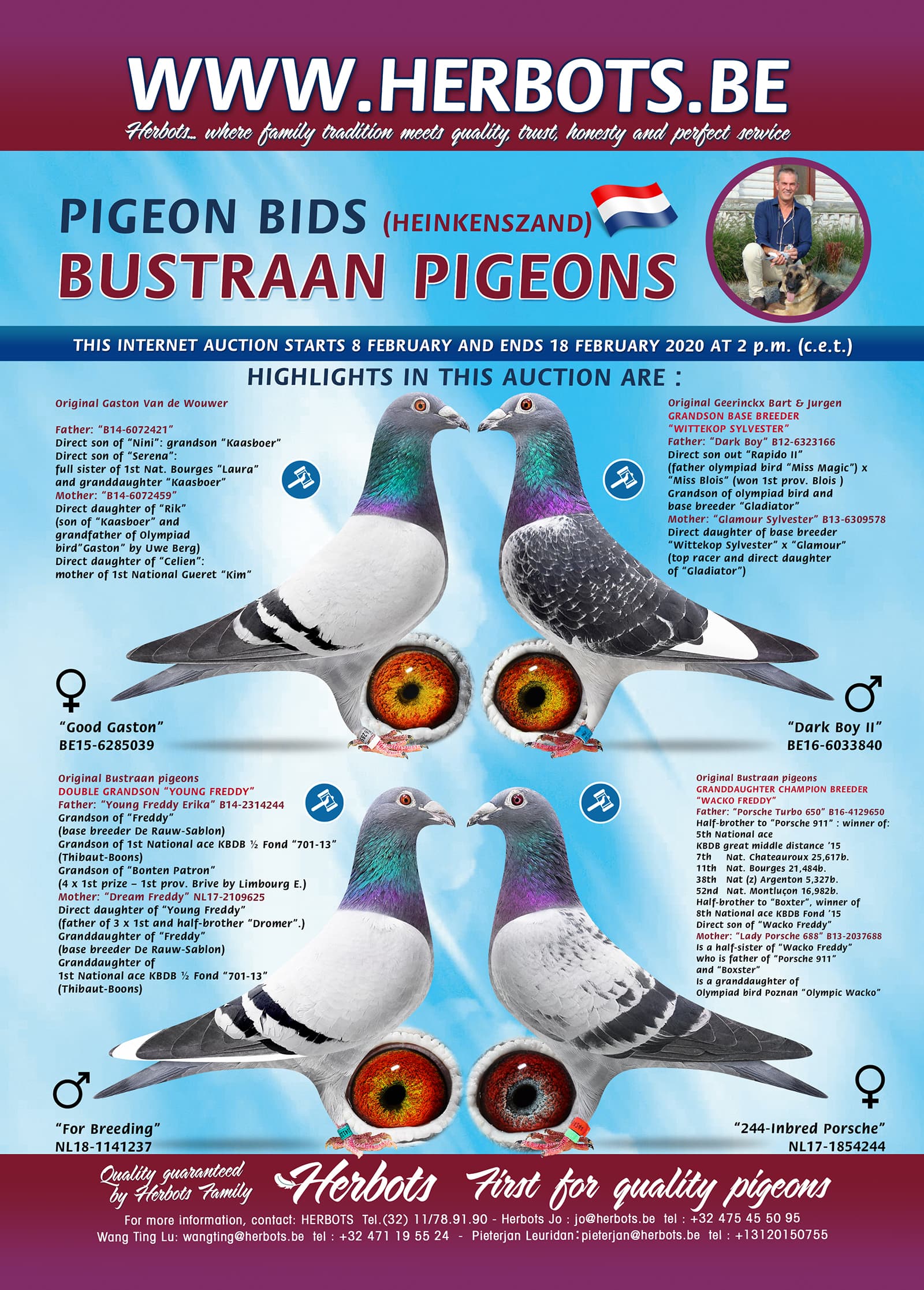 Arie Bustraan父亲: “B14-6072421” “尼尼”直子,“尼尼”是 “乳酪小子”直孙 “莎琳娜”直子,“莎琳娜”是“劳拉”(波治国家赛1名)之全姐妹以及“乳酪小子”直孙女母亲: “B14-6072459”“瑞克” ( “乳酪小子”直子以及乌维·伯格使翔的奥林匹克代表鸽 “葛斯顿”之祖父) 直女“赛琳”直女, “赛琳”是“金姆”(盖雷国家赛1名)之母