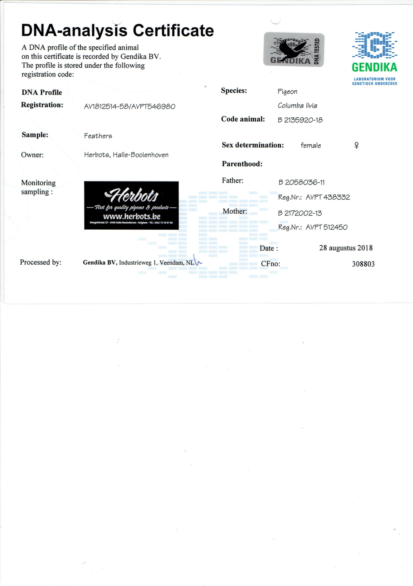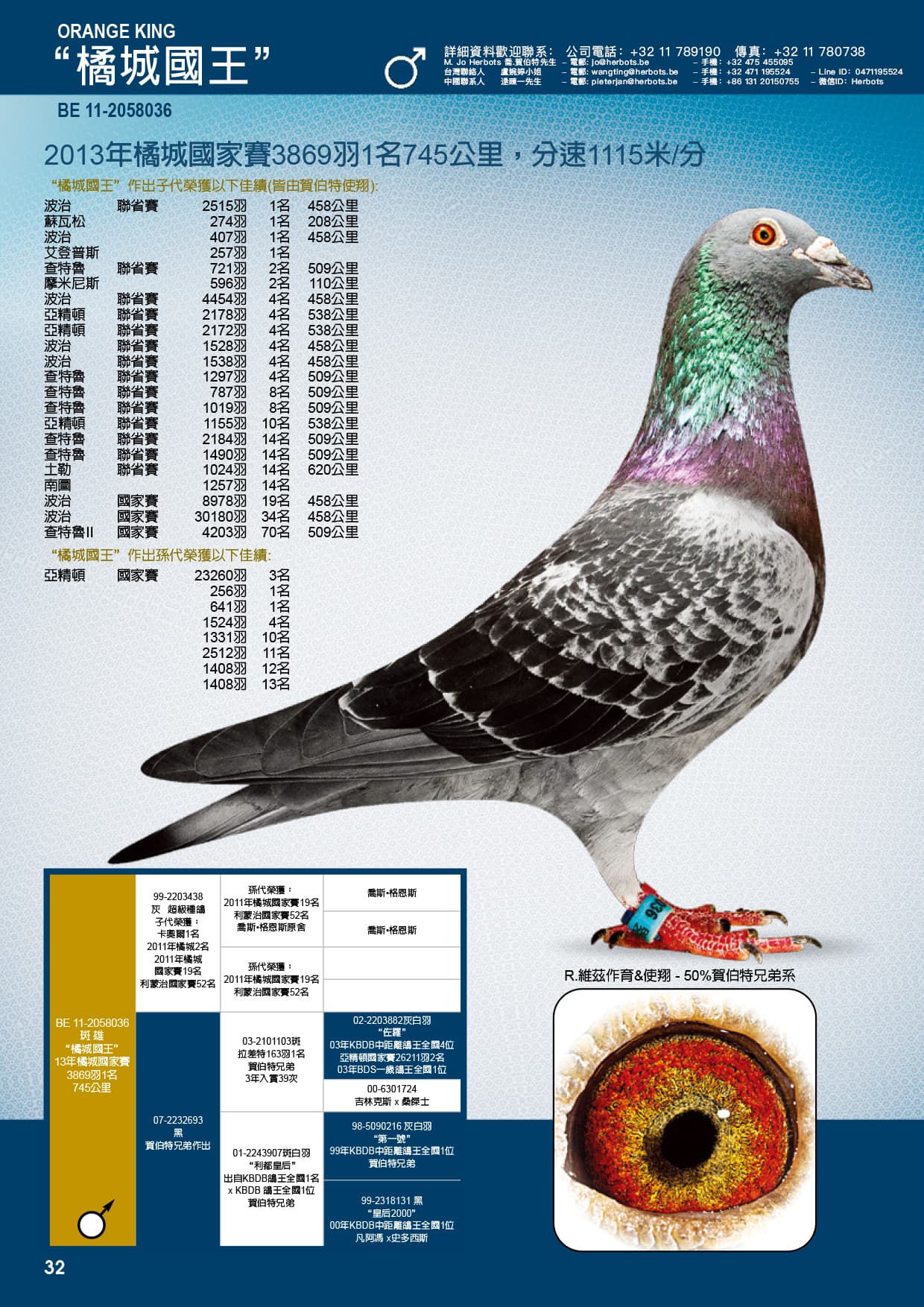 父亲:BE11-2058036 “橘郡国王”橘郡国家赛 3869羽1名745公里子代荣获:波治联省 2515羽1名 波治 407羽1名母亲:BE13-2172002图勒国家赛区 2916羽23名 -图勒联省 2916羽 9名 -2次卡奥尔国家赛1名直女