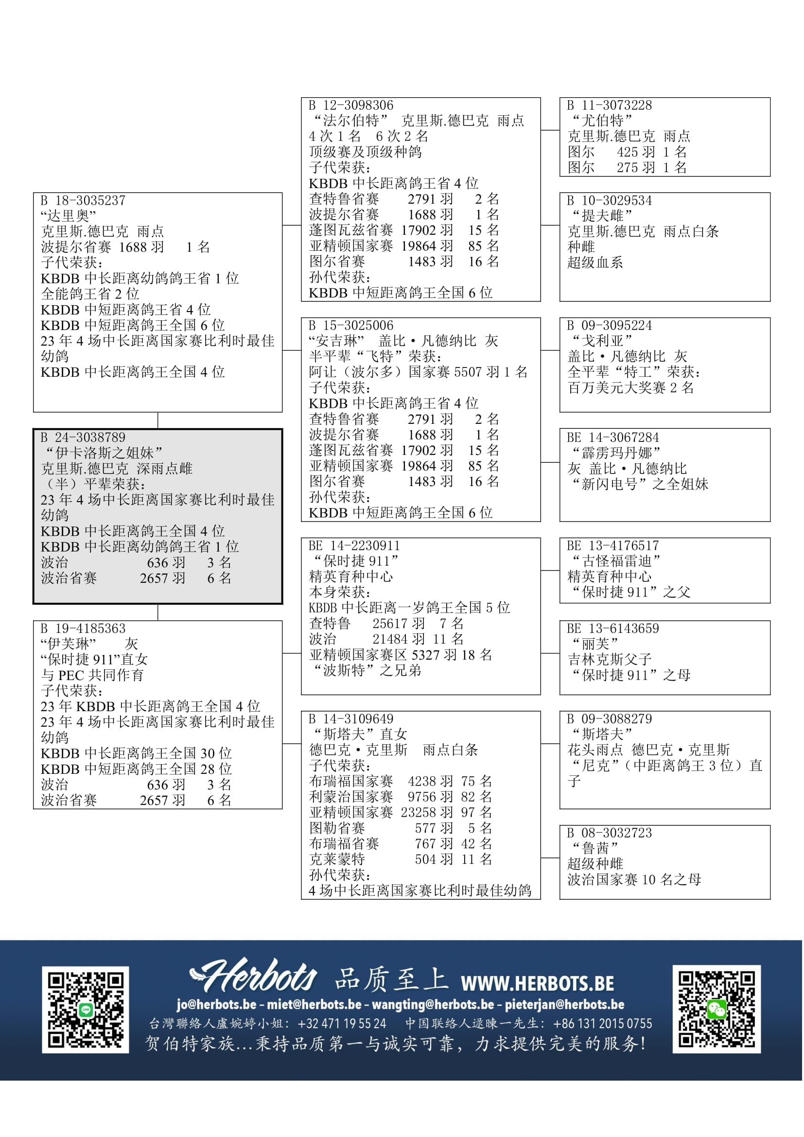 世界铭鸽“保时捷 911” (荣获 KBDB中长距离一岁 鸽王全国5位 – PEC目前的基础种鸽) x “斯塔夫直女” (“百战天王”之父之姐妹@ 玛斯 A.)直女