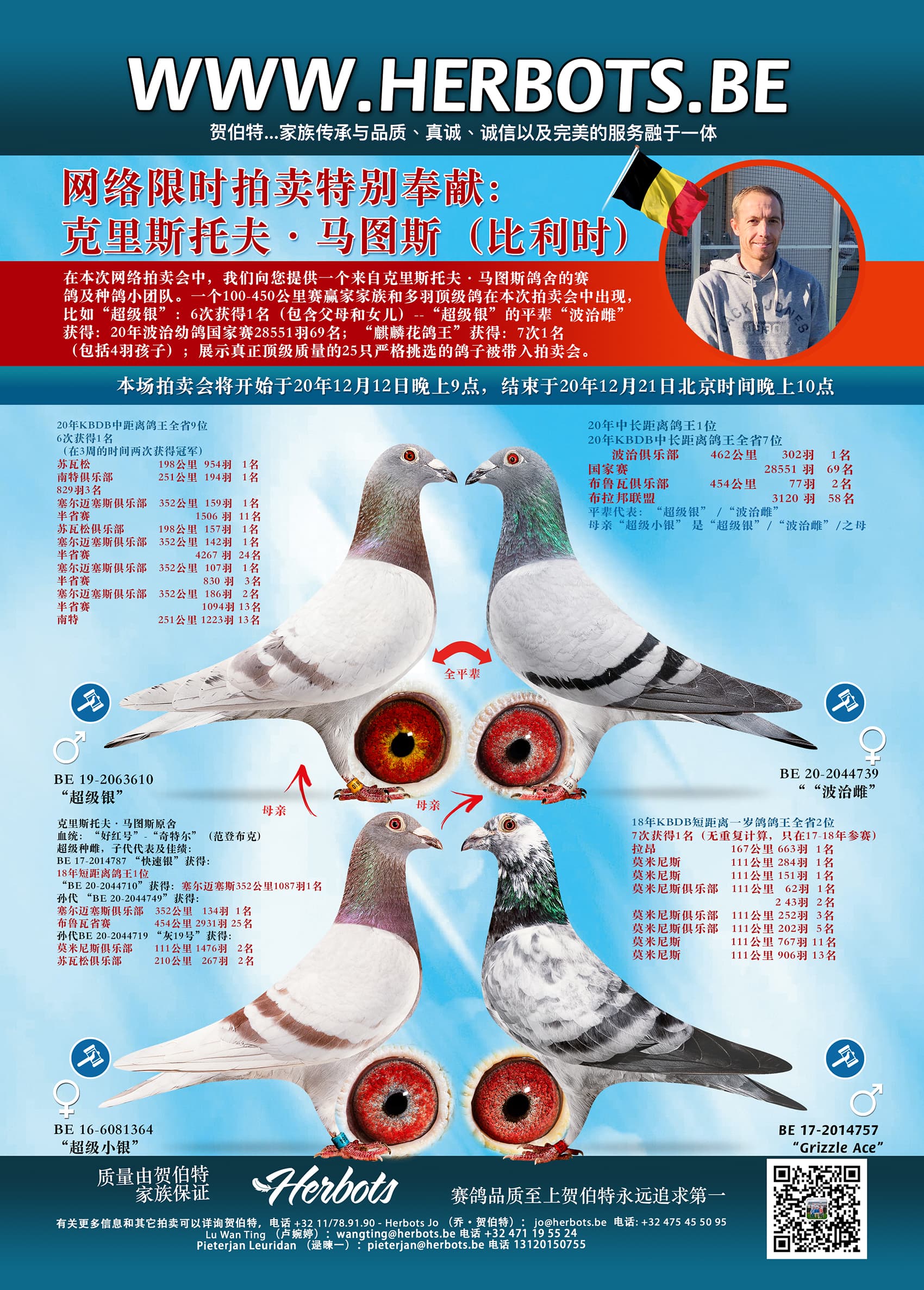 在本次网络拍卖会中,我们向您提供一个来自克里斯托夫·马图斯鸽舍的赛鸽及种鸽小团队。一个100-450公里赛赢家家族和多羽顶级鸽在本次拍卖会中出现,比如“超级银”:6次获得1名(包含父母和女儿)--“超级银”的平辈“波治雌”获得:20年波治幼鸽国家赛28551羽69名;“麒麟花鸽王”获得:7次1名(包括4羽孩子);展示真正顶级质量的25只严格挑选的鸽子被带入拍卖会。