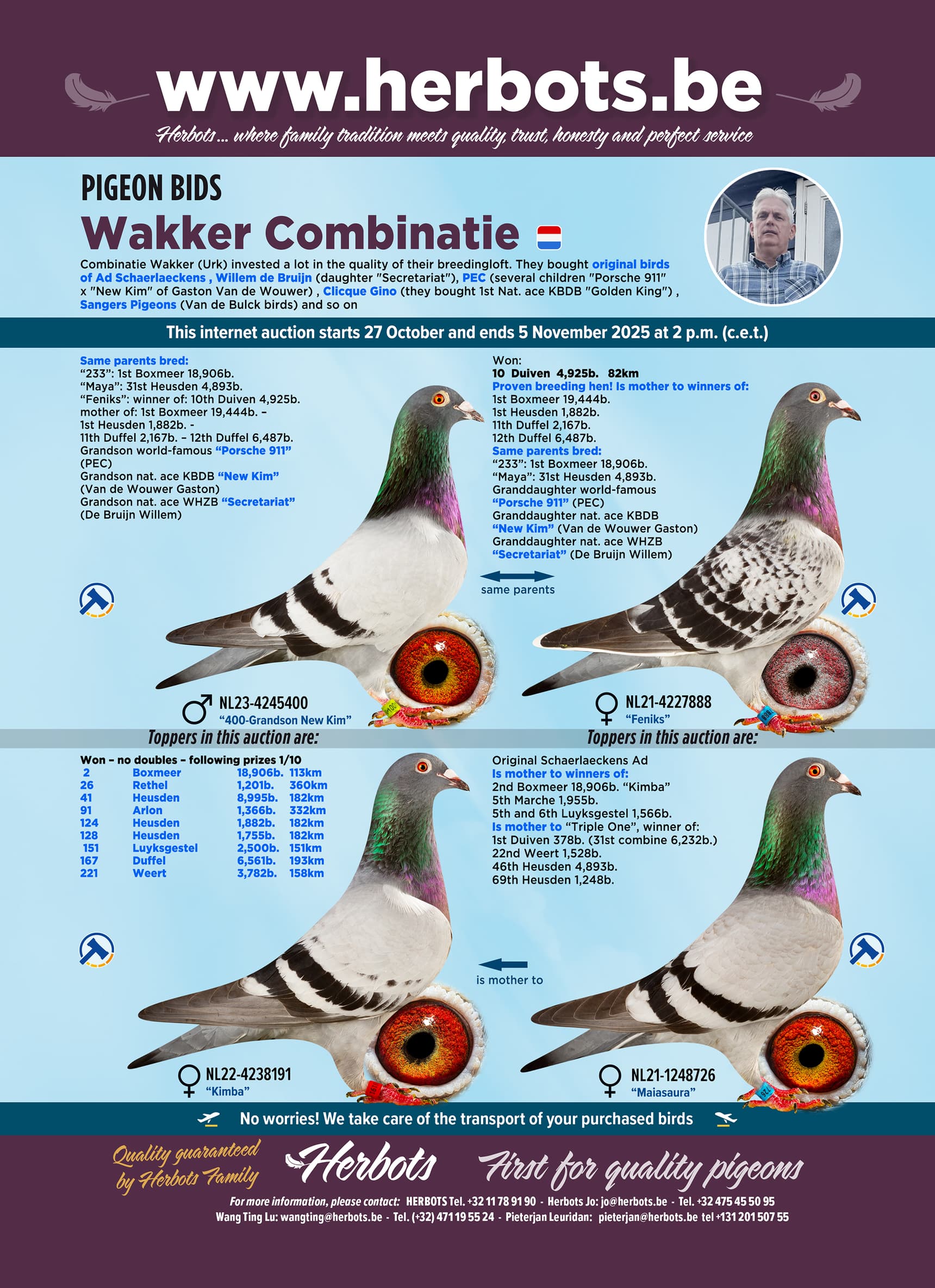 In this auction Combinatie Wakker offers children out these champion breeders, combined with some top winning birds such as "Kimba" (2nd/18,906b. - 41st/8,995b.)