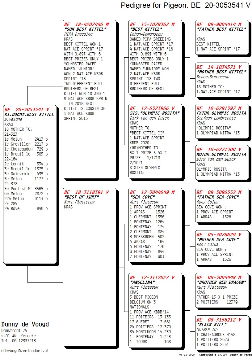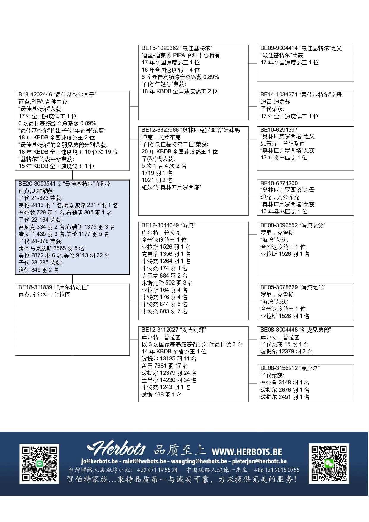 以3场国家赛获得最佳鸽3名–2014年KBDB全省鸽王1位–波堤尔国家赛13.135羽11名 –盖雷国家赛7.681羽17名 –波堤尔国家赛12.379羽24名 –孟吕松国家赛14.230羽34名–丰特奈1.243羽1名 –透斯168羽1名