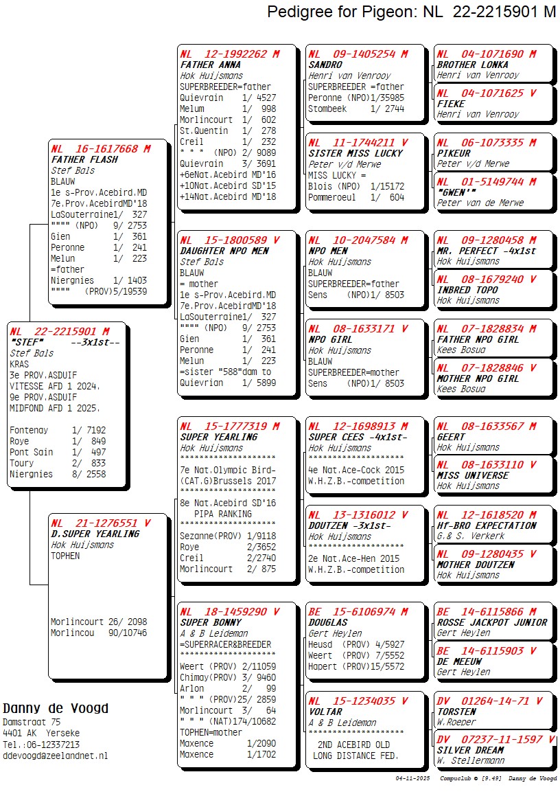 出自“319-15”,”超级一岁鸽”,胡斯曼鸽舍,荣获: 2017年布鲁赛尔奥林匹克全国G类7位 ,塞尚省赛 9.118羽1名–洛伊 3.652羽2名 –彻尔 2.740羽2名 –墨林科特 875羽2名 x “290-18”,”超级波妮” ,A & B 雷德曼,荣获威尔特省赛11.059羽2名–奇美省赛 9.460羽3名–亚隆省赛2.859羽25名