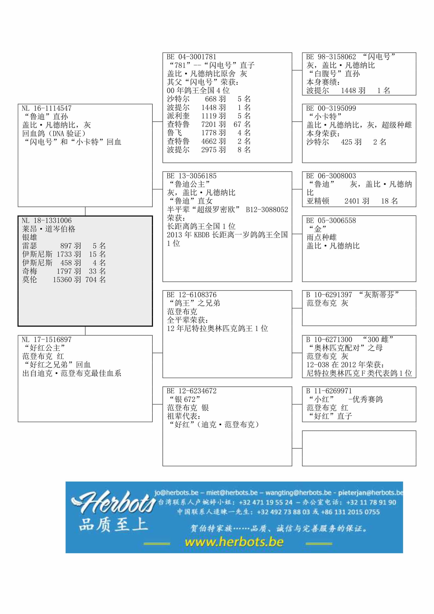 荣获 (无重复计算) 22 次前 1/4 – 7 次前1/10 – 3 次前1/100雷瑟 897羽 5名 193公里伊斯尼斯 458羽 4名 103公里伊斯尼斯 1,733羽 15名 103公里奇梅 1,797羽 33名 152公里雷瑟 625羽 35名 193公里梅特 1,912羽 177名 117公里莫伦省赛 15,360羽 704名 343公里