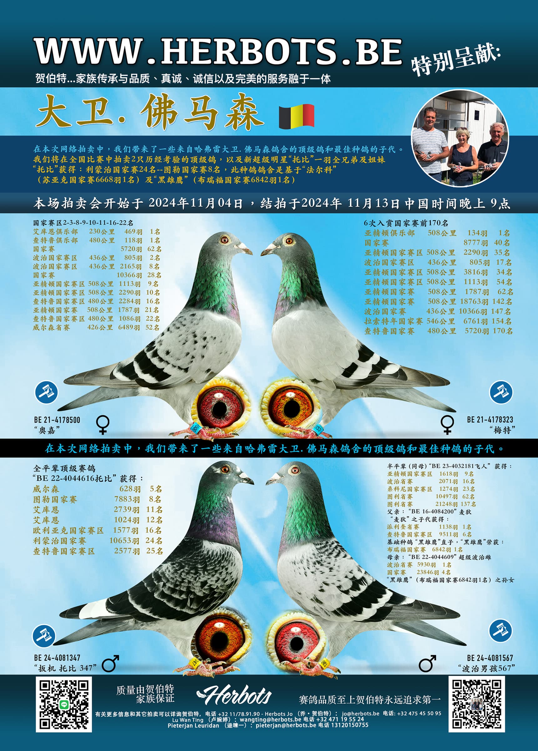 在这次网上拍卖中,我们带来了一些来自加夫雷镇的大卫·佛马森鸽舍的顶级赛鸽和最佳种鸽的子代。