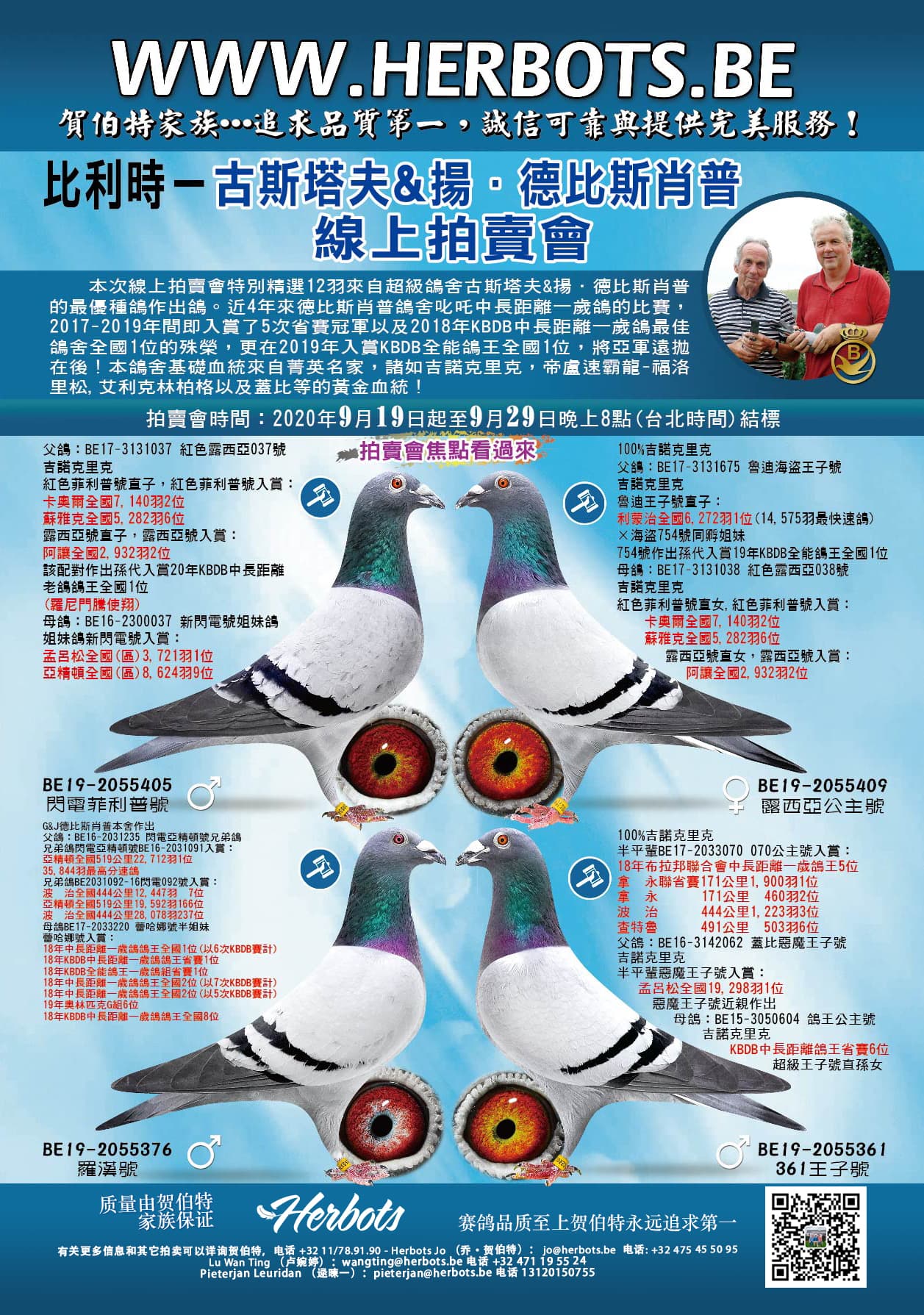 在本次网上拍卖中,我们为您提供12羽德比斯肖普.斯塔夫&杨鸽舍(De Bisschop Gustaaf & Jan)最佳种鸽的子代。 在过去的4年中,他们在一岁鸽组中长距离赛是最佳鸽舍之一! 在2017-2019年,他们获得了5次1省冠军,并成为2018年KBDB中长距离一岁鸽组最佳鸽舍全国冠军,遥遥领先于第二名。而在2019年他们赢得了KBDB全能鸽王全国1位。 吉诺·克里克(Gino Clicque),帝卢-速霸龙-福洛里松(De Rauw Sablon-Florizoone),埃里克·林伯格(Erik Limbourg)-盖比·凡德纳比(Gaby Vandenabeele)的黄金育种系是这里的基础。