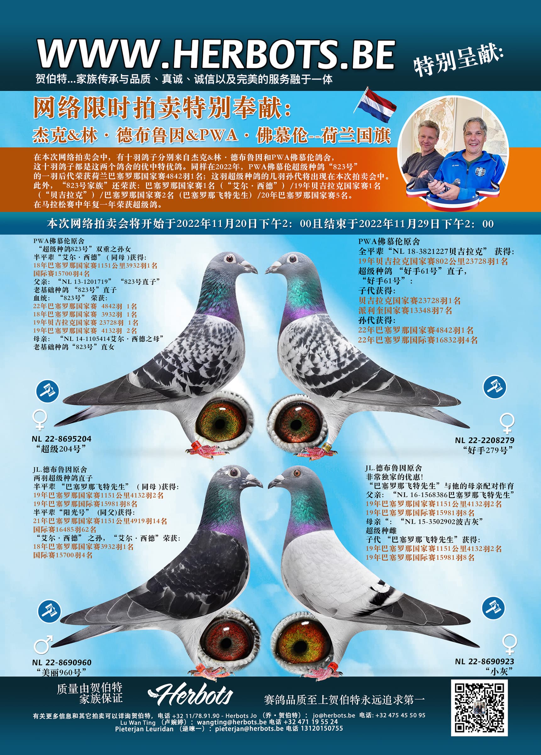 本场拍卖会提供 10只迪布恩-范德梅伦最厉害血统作出的鸽子。2022年荷兰巴塞罗那国家赛冠军又是范德梅伦“823”的后代,以前“823”后代已经荣获巴塞罗那国家赛冠军(艾西德)、贝杰拉克国家赛冠军(贝杰拉克)、巴塞罗那国家赛亚军(健康巴塞罗那先生)、巴塞罗那国家赛5名等