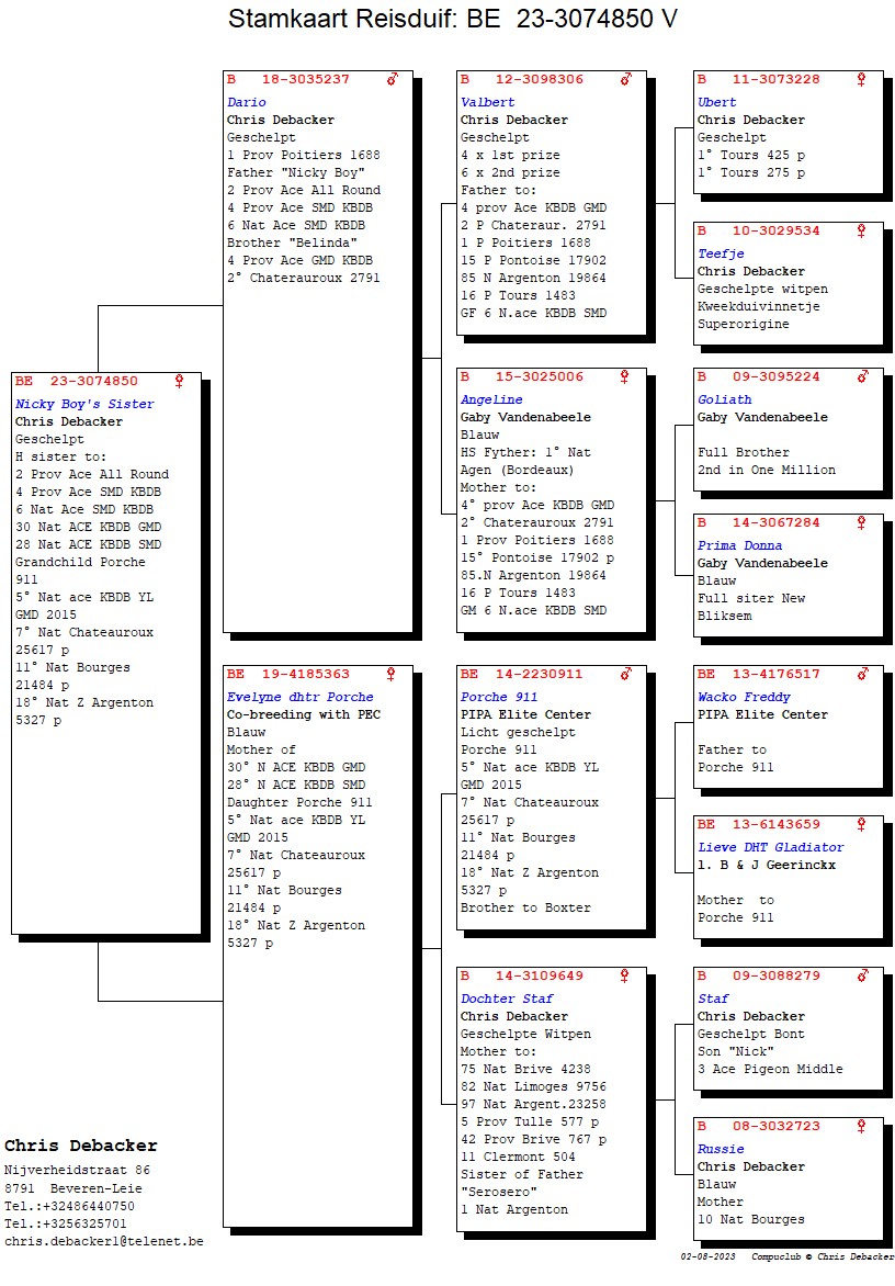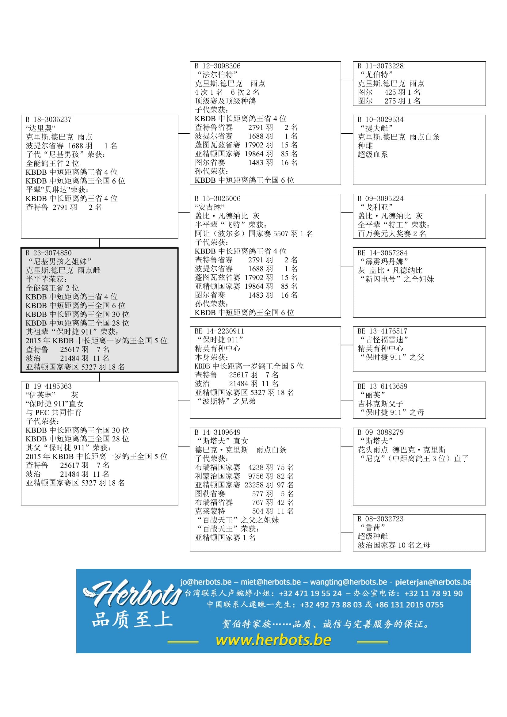 顶级全平辈代表:“贝琳达”(KBDB长距离幼鸽鸽王省4位) – “巴尔塔莎” (蓬图瓦兹 17,902羽15名) – “班代” – “柯文” (亚精顿国家赛 19,864羽85名) - 等等