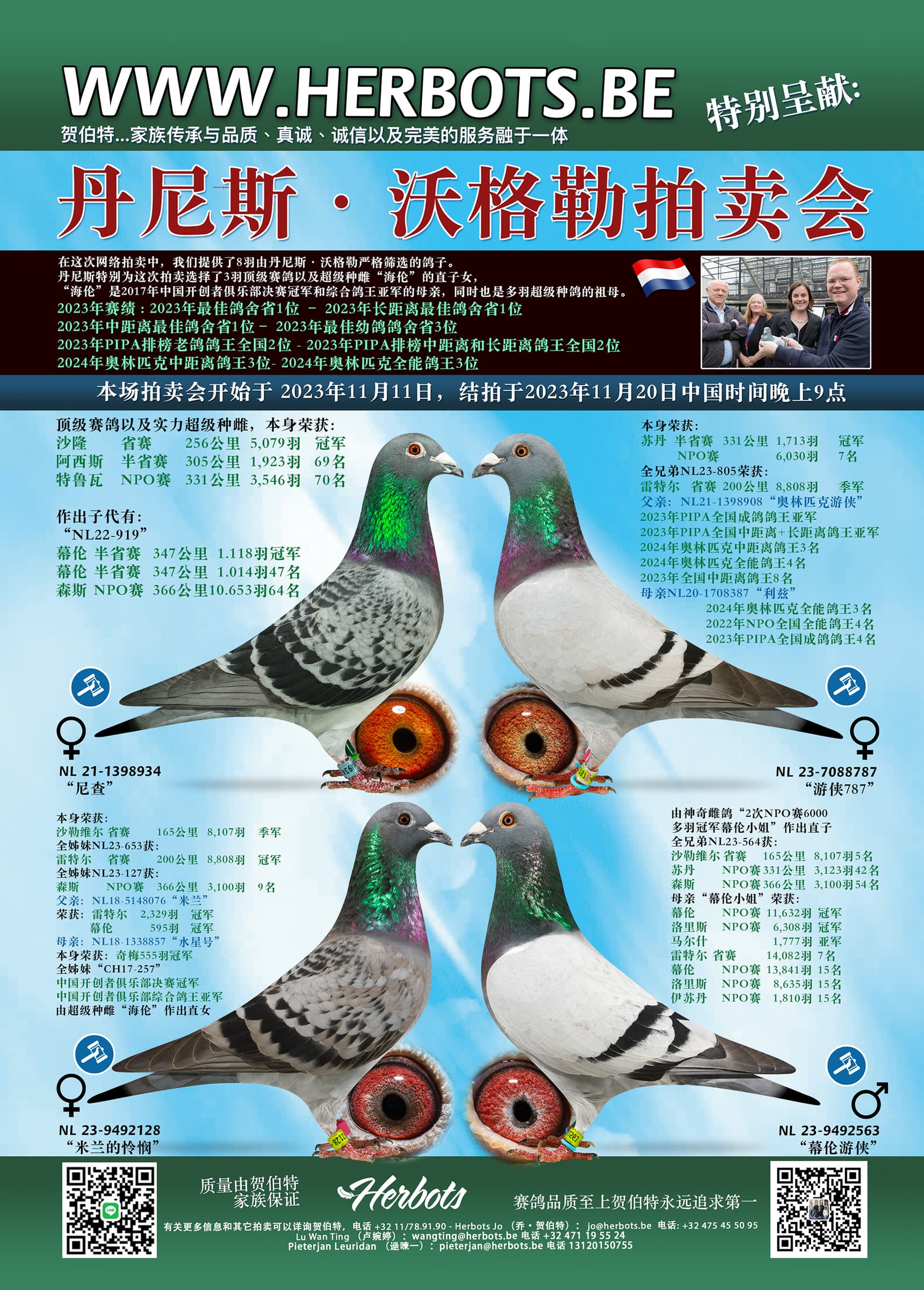 在这次网络拍卖中,我们提供了8羽由丹尼斯·沃格勒严格筛选的鸽子。丹尼斯特别为这次拍卖选择了3只顶级赛鸽,以及超级种雌“海伦”的孩子,“海伦”是2017年中国开创者俱乐部决赛冠军和综合鸽王亚军的母亲,同时也是多羽超级种鸽的祖母。.