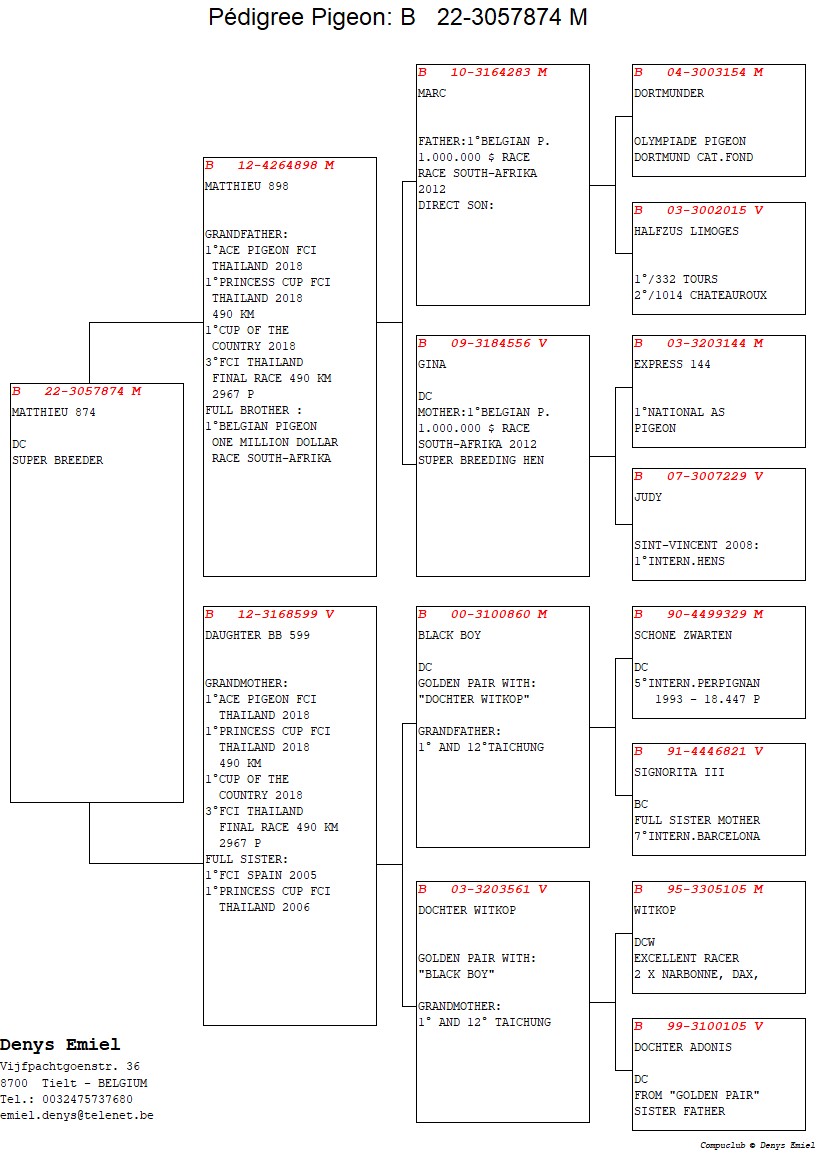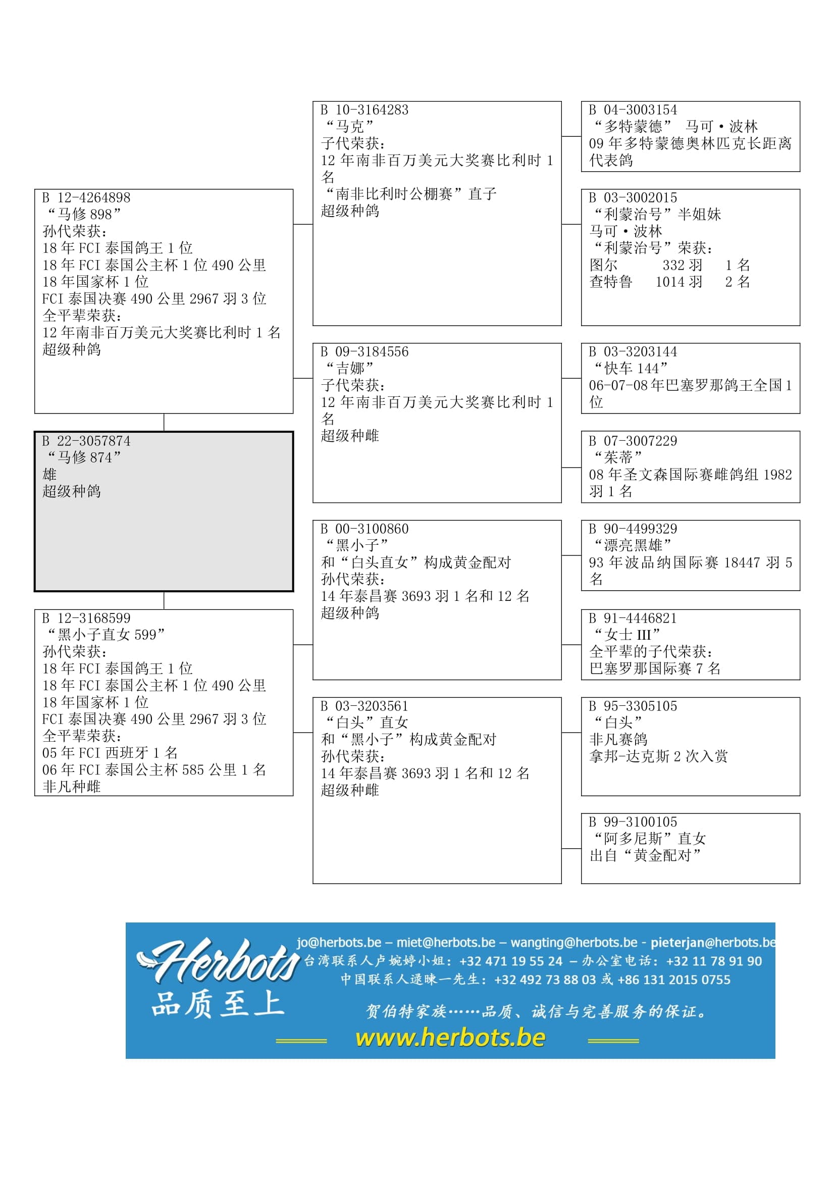 出自“黑小子”x “白头直女”; “黑小子”x “白头直女”的孙代荣获: 2014年泰昌赛3,693羽1名和12名 (2014年) – 03年FCI 西班牙加泰罗尼亚1名 – 2006年泰国公主杯1名(580公里)