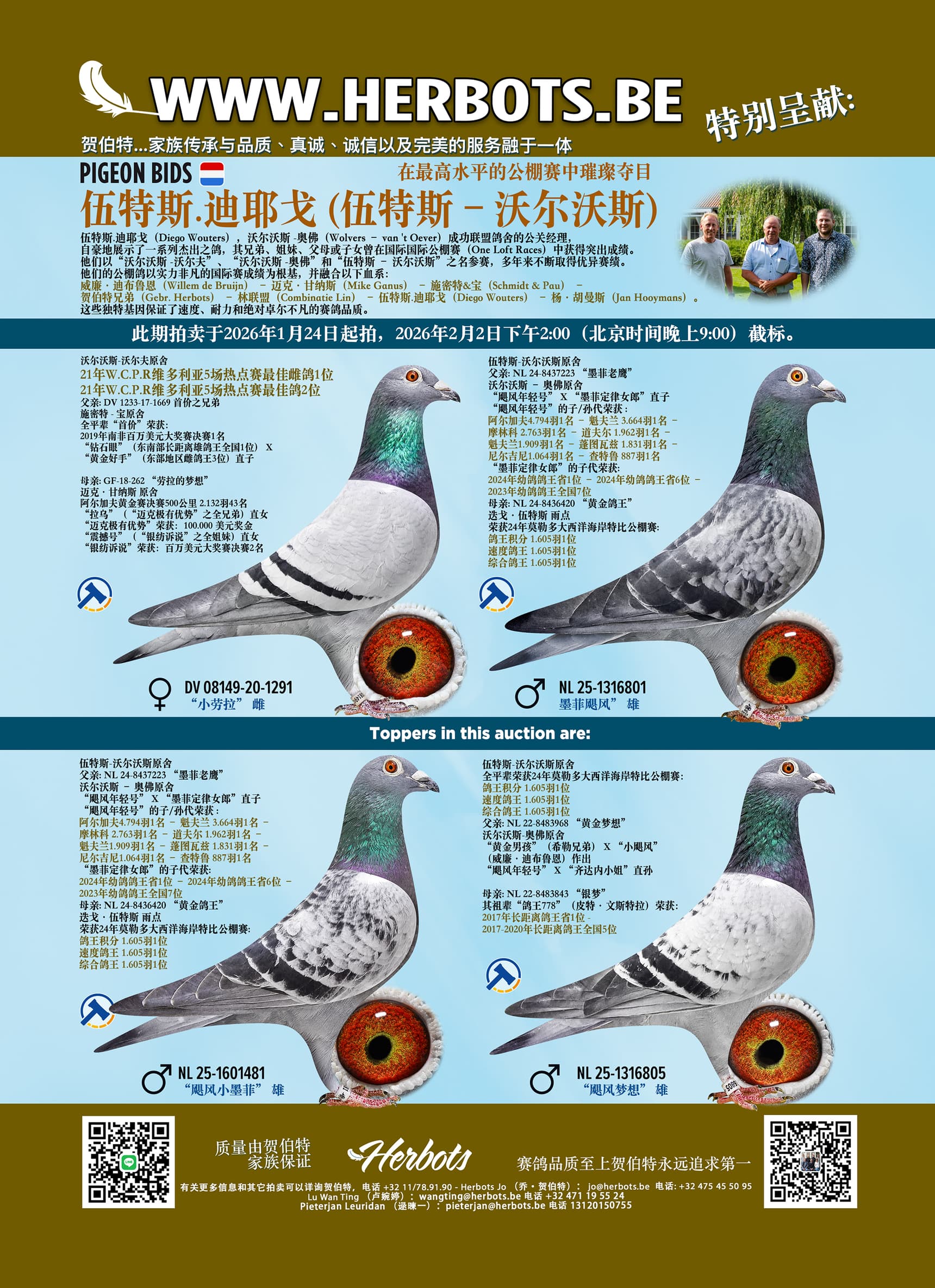 伍特斯.迪耶戈(Diego Wouters),沃尔沃斯 -奥佛(Wolvers – van 't Oever)成功联盟鸽舍的公关经理,自豪地展示了一系列杰出之鸽,其兄弟、姐妹、父母或子女曾在国际国际公棚赛(One Loft Races)中获得突出成绩。他们以“沃尔沃斯 -沃尔夫”、“沃尔沃斯 -奥佛”和“伍特斯 – 沃尔沃斯”之名参赛,多年来不断取得优异赛绩。
